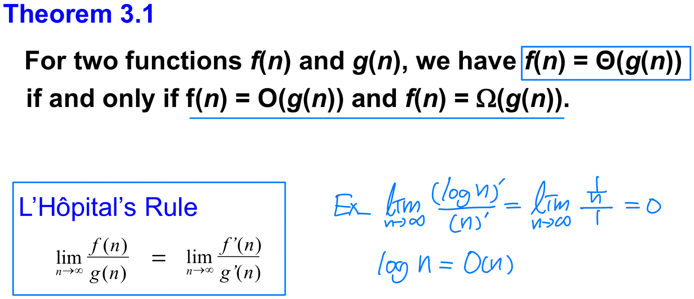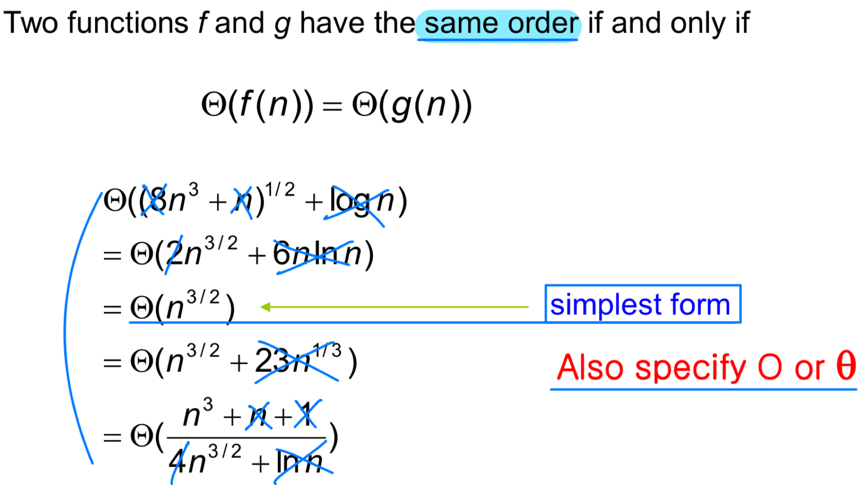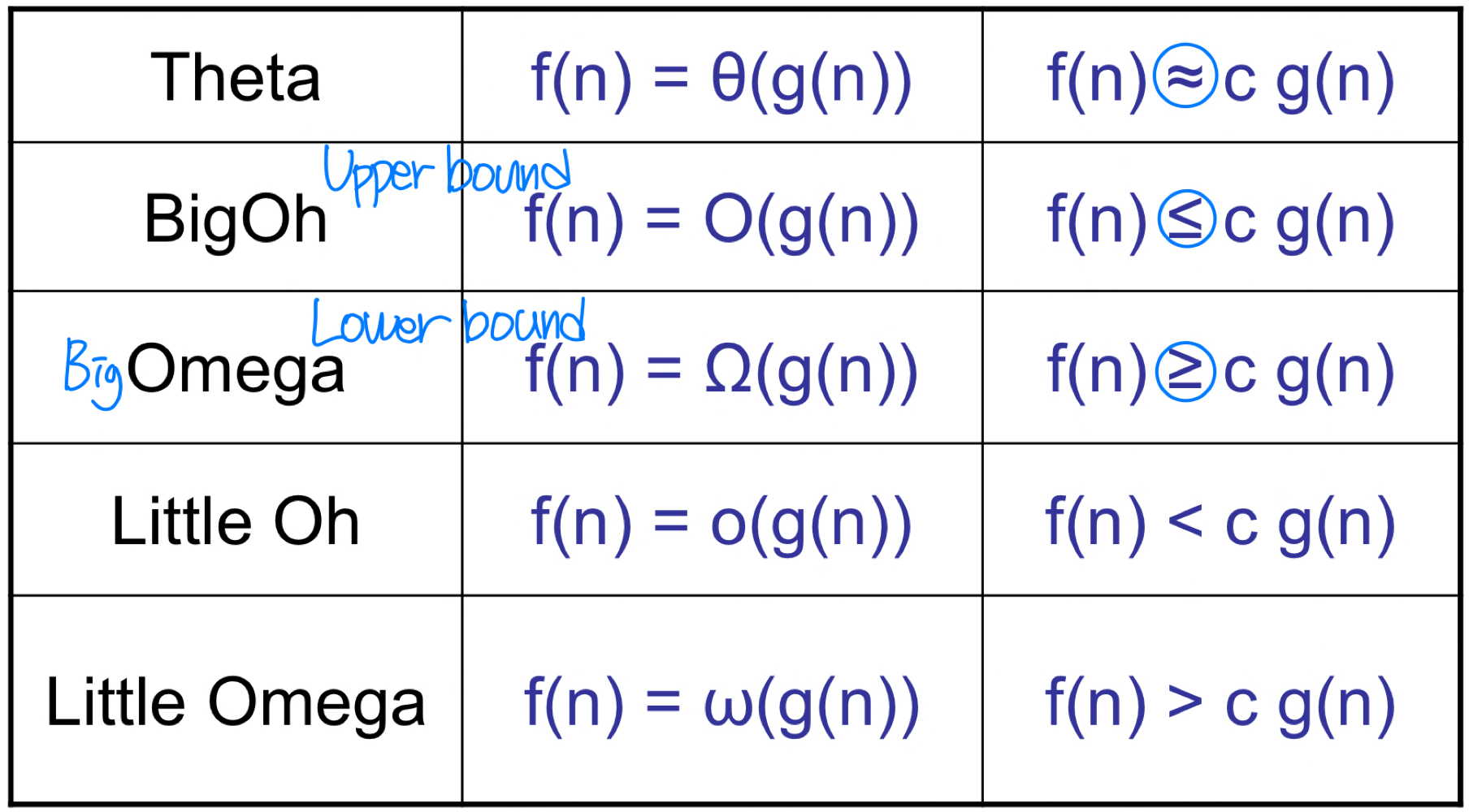 Big-O 표기법은 함수의 점근적 상한을 나타낸다. 이라 함은, 충분히 큰 에 대해 이 을 넘지 않는 양의 상수 와 가 존재한다는 뜻이다.