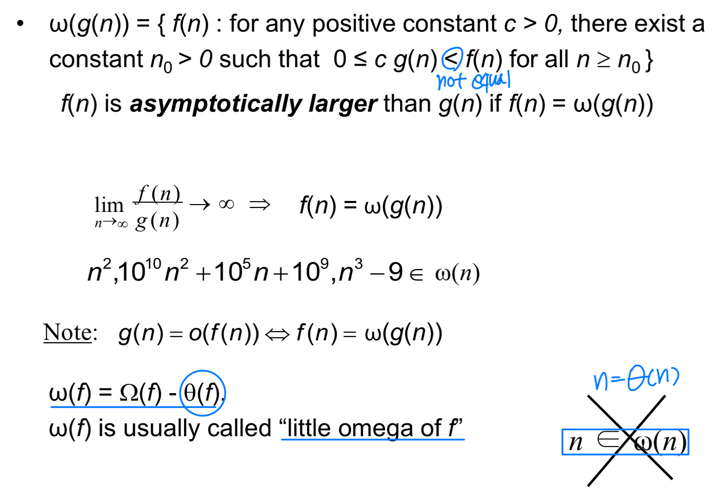 Little-omega 표기법은 Big-Omega보다 더 엄격한 하한을 나타낸다. Little-o와 대칭적인 관계로, 이 보다 확실히 빠르게 증가함을 의미한다.