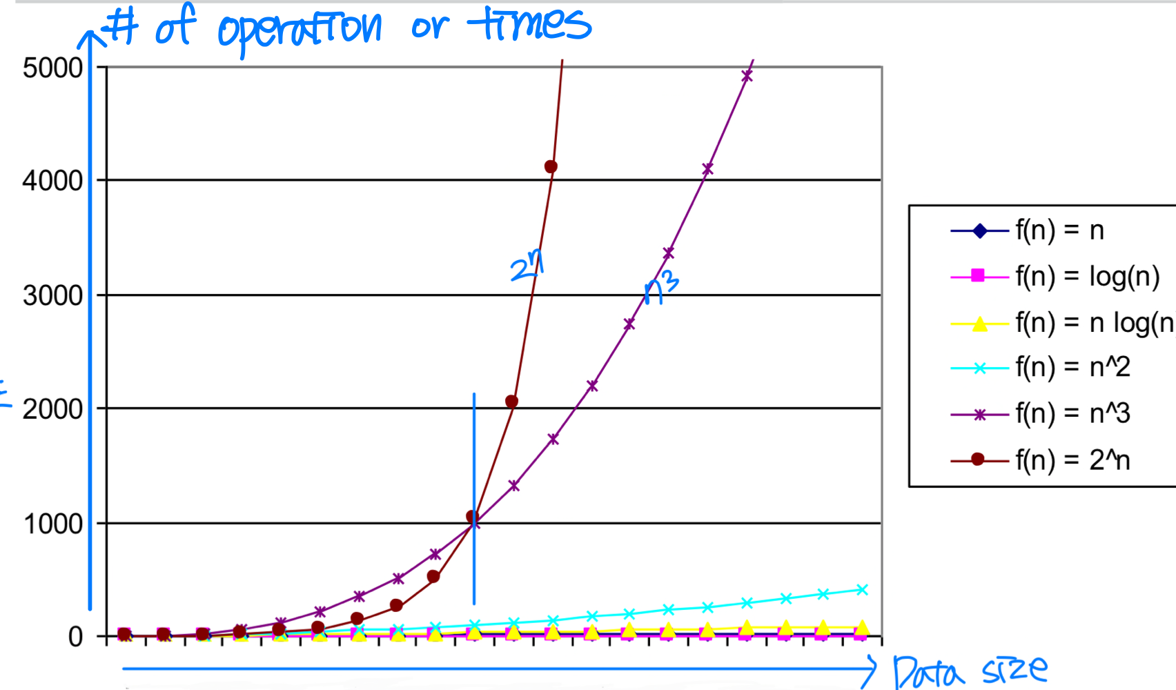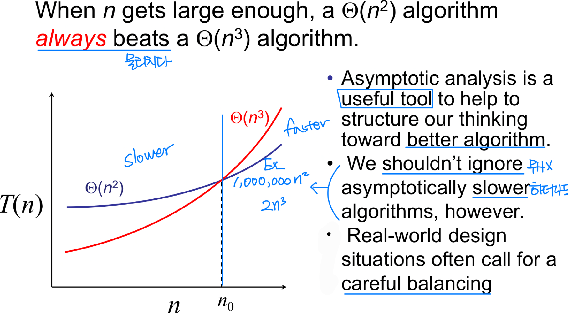 이때 점근적 효율성(Asymptotic Efficiency) 이라는 개념을 사용한다. 입력 크기가 한없이 커질 때 수행 시간이 어떻게 증가하는지를 분석하는 것이다. 작은 입력에서는 비효율적인 알고리즘이 더 빠를 수도 있지만, 입력이 충분히 커지면 점근적으로 더 효율적인 알고리즘이 반드시 승리한다.