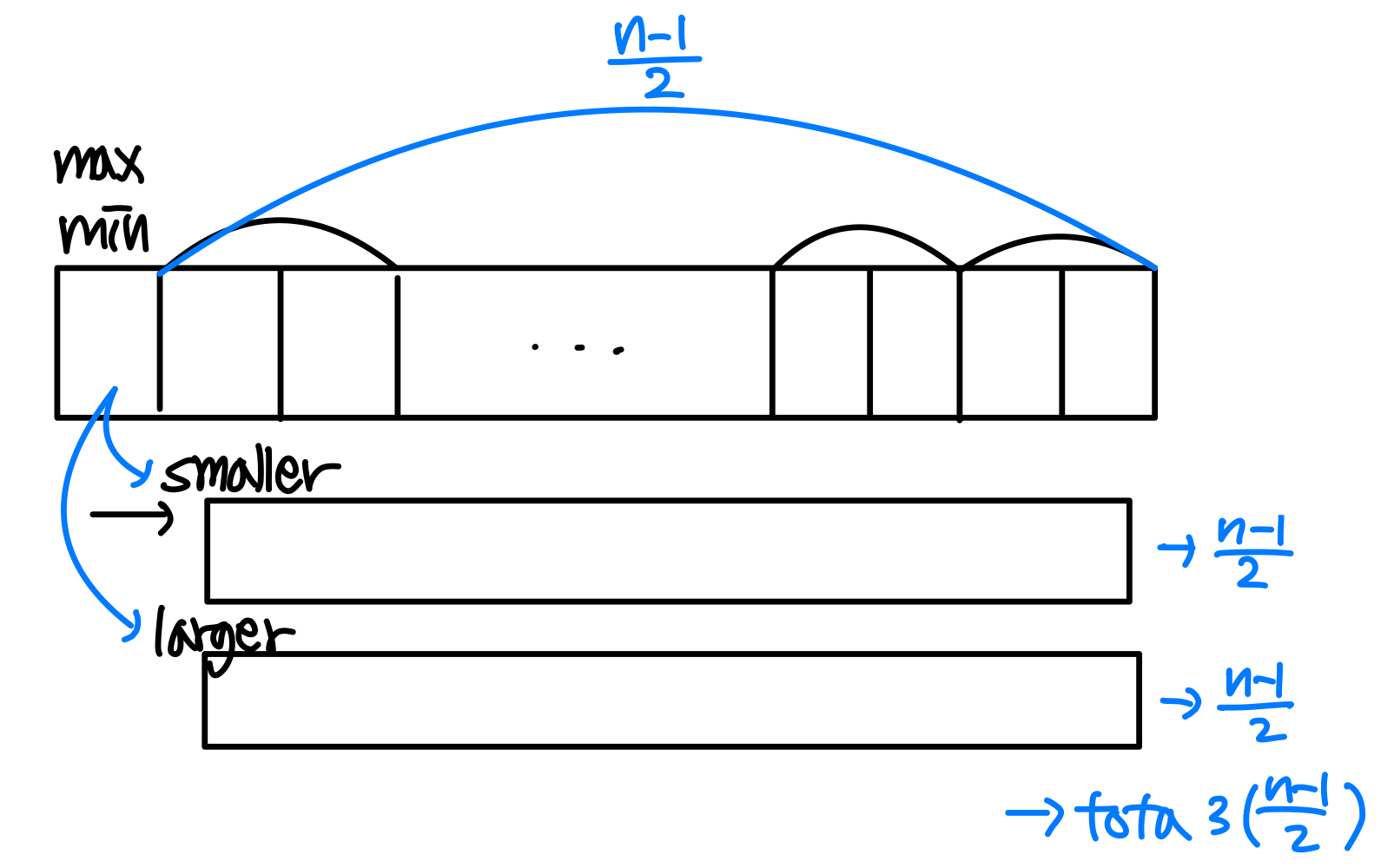 n이 홀수인 경우: 첫 번째 원소를 min과 max 모두로 초기화한 뒤, 나머지를 쌍으로 처리한다. 총 3(n-1)/2번 비교가 필요하다.