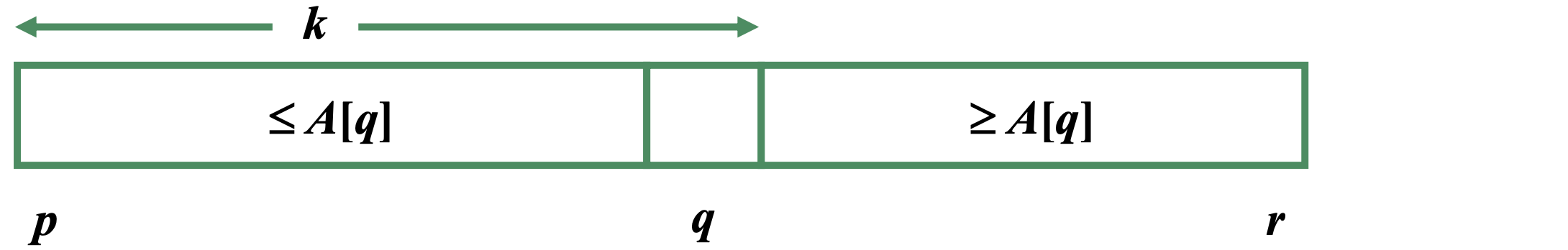 배열 A[p..r]을 partition하면 피벗 A[q]를 기준으로 두 부분 배열 A[p..q-1]과 A[q+1..r]이 만들어진다. 피벗이 p번째부터 세었을 때 k번째라 하면: