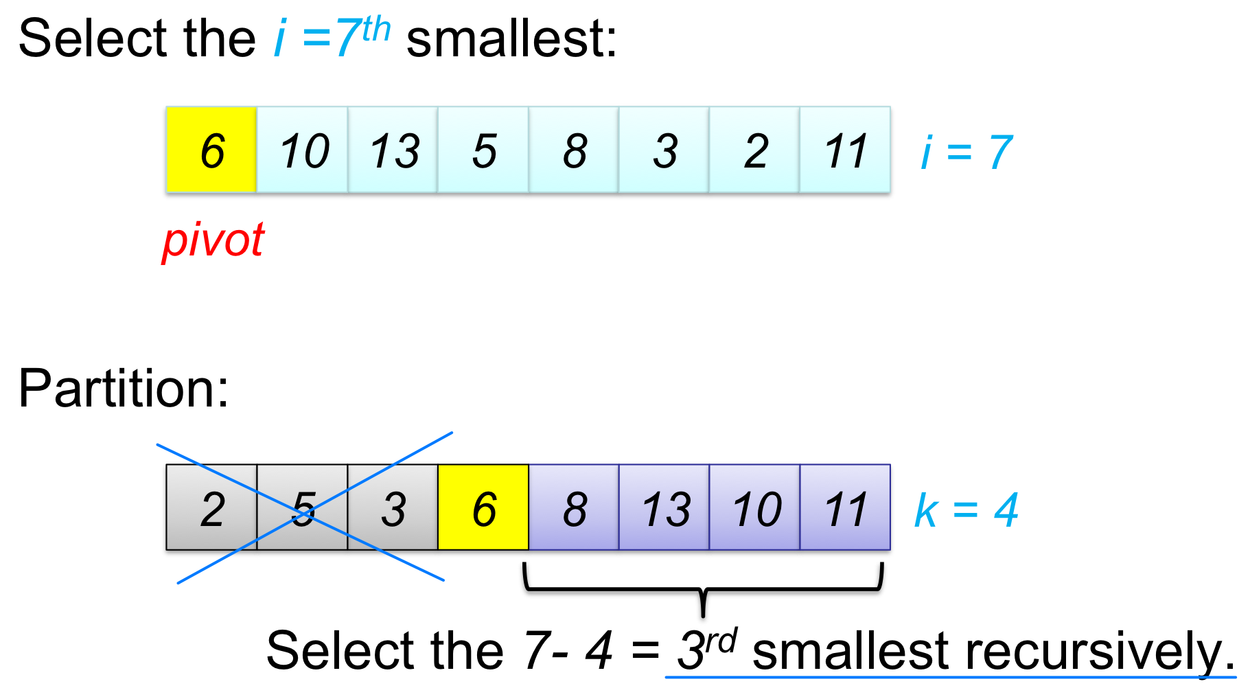 - i > k 이면: 답은 오른쪽 부분 배열 A[q+1..r] 에 있다. 이쪽에서 (i-k)번째를 찾는다.