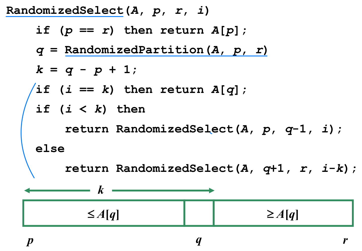 - i = k 이면: A[q]가 바로 답이다. 반환한다.