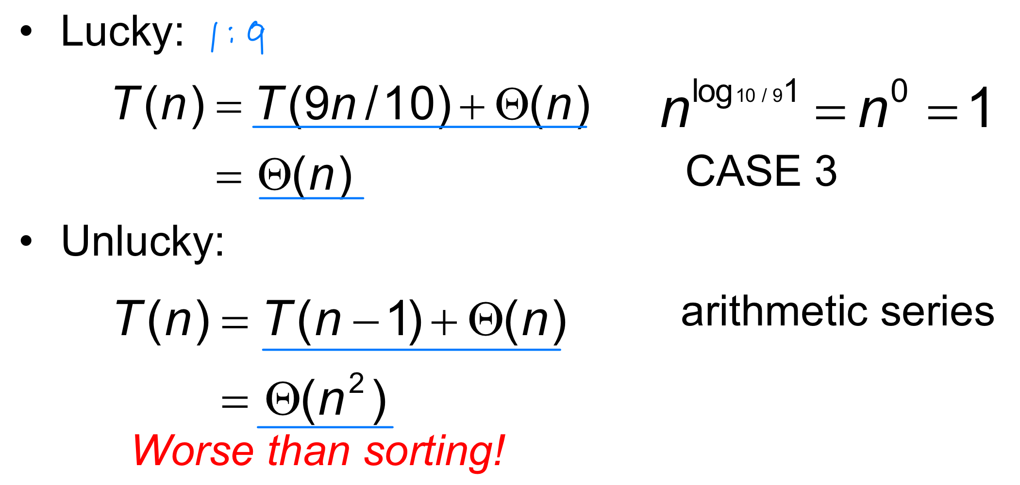 점화식을 풀면 이 된다. 최악의 경우에도 선형 시간을 보장하지만, 숨겨진 상수 계수가 커서 Randomized Select보다 실제 성능은 떨어진다. 그래서 실무에서는 Randomized Select를, 이론적 보장이 필요할 때만 이 알고리즘을 사용한다.