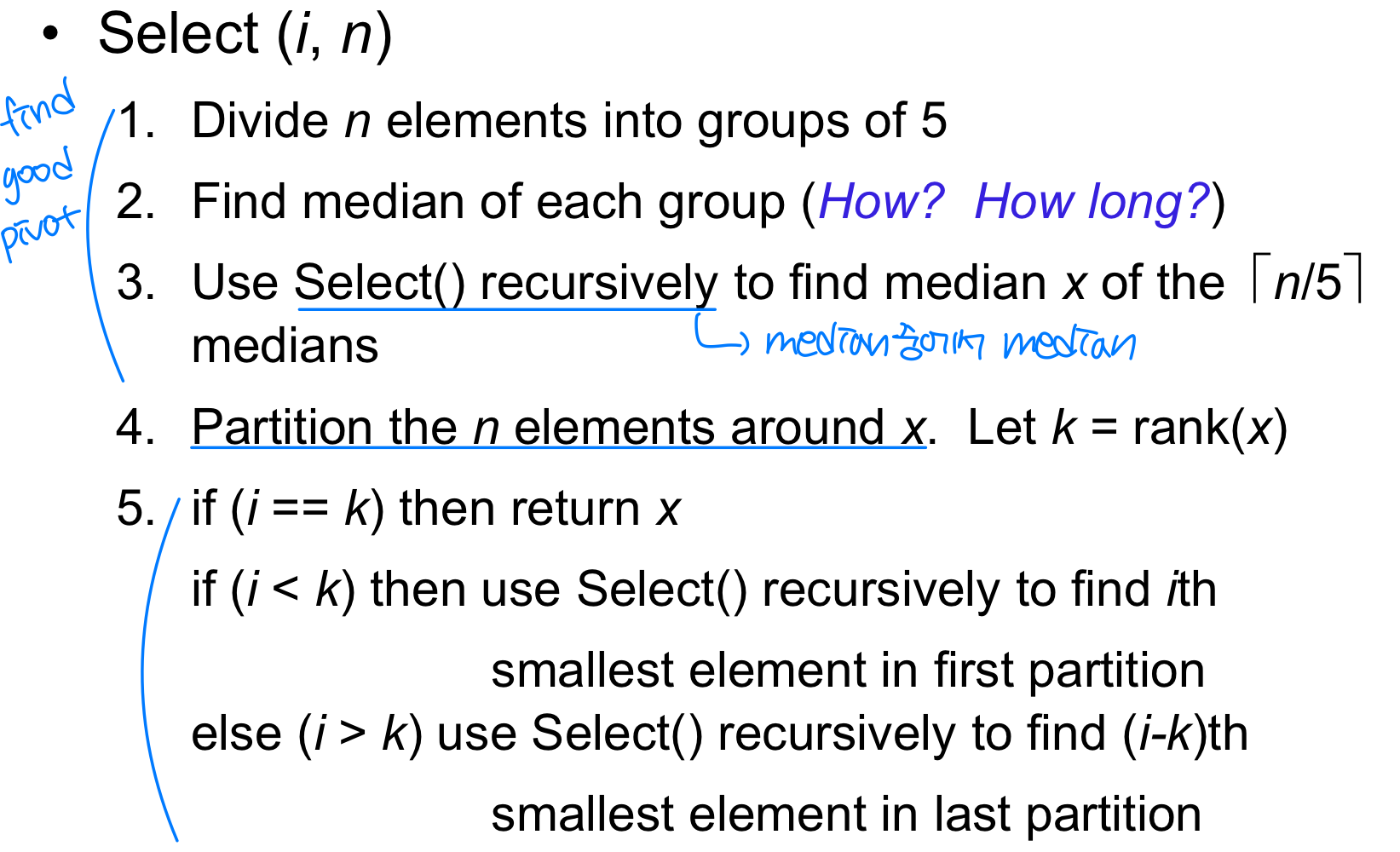 Step 4. x를 피벗으로 partition한 뒤, Randomized Select와 동일한 방식으로 재귀한다.