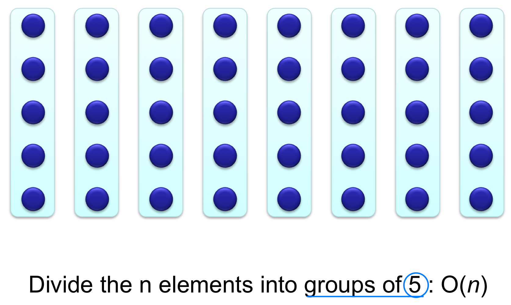 Step 1. n개의 원소를 5개씩 그룹으로 나눈다 (마지막 그룹은 5개 미만일 수 있다).