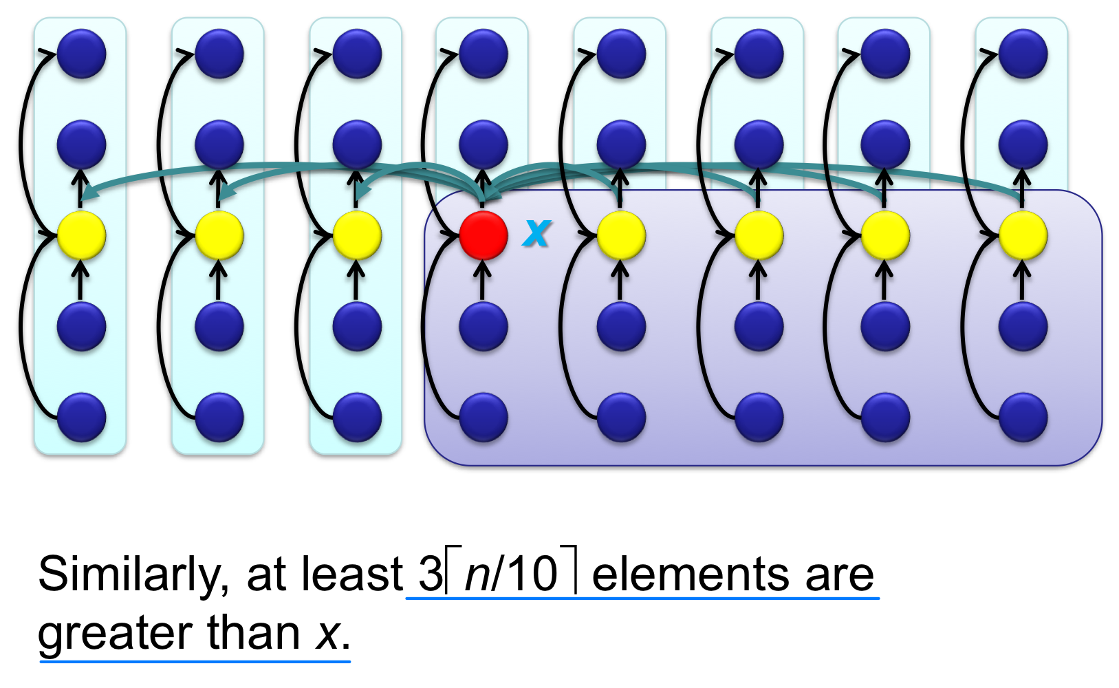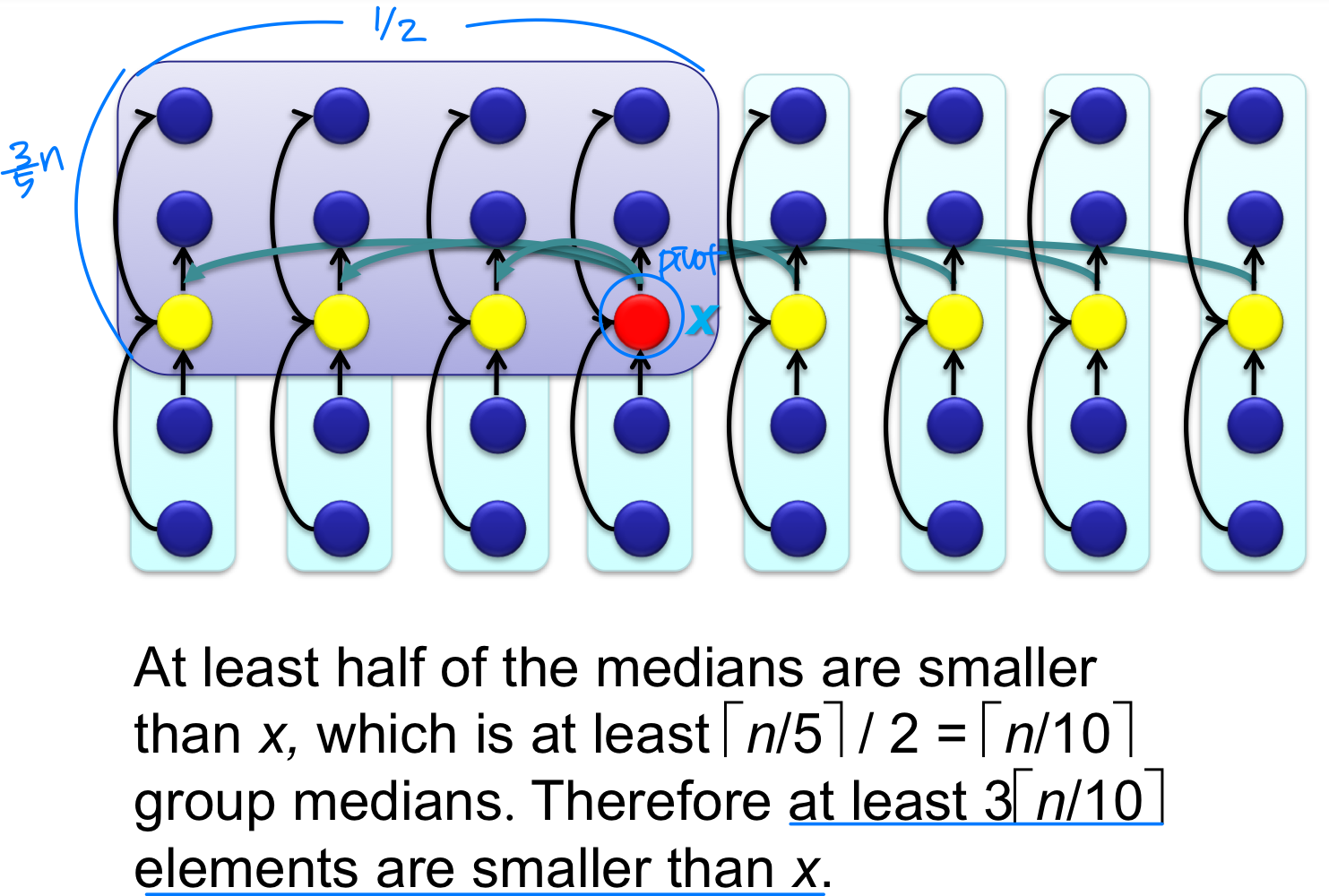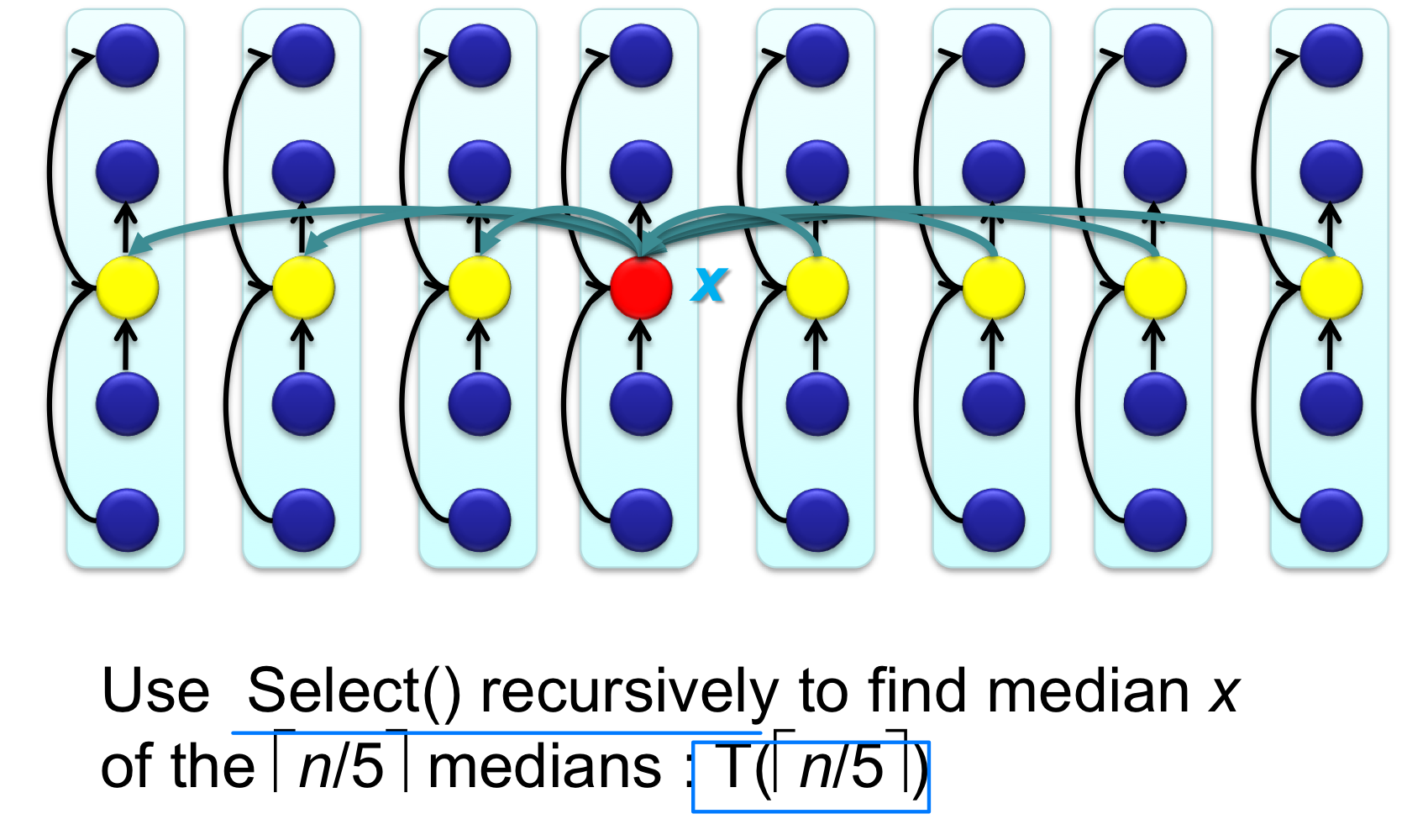 Step 3. 이 중앙값들의 중앙값(Median of Medians) 을 재귀적으로 구한다. 이것이 피벗 x가 된다.