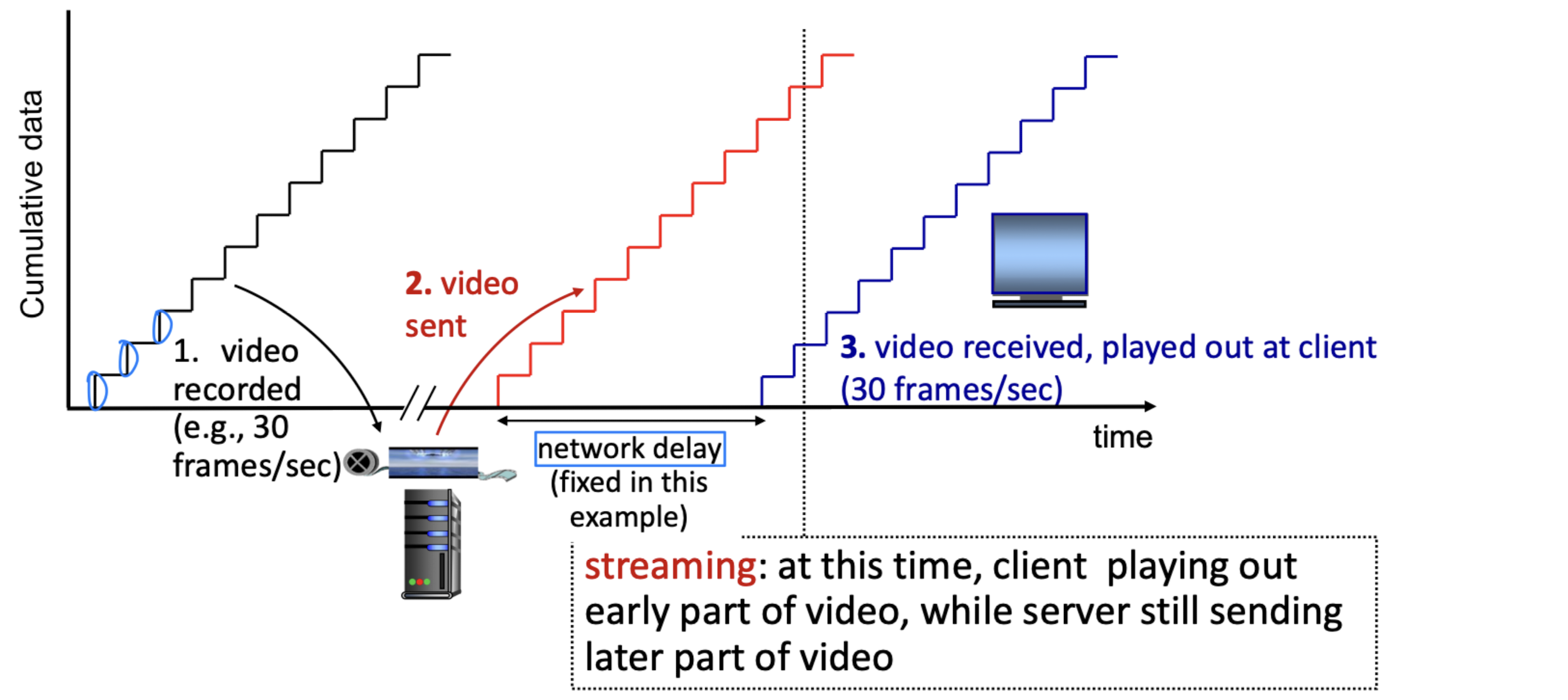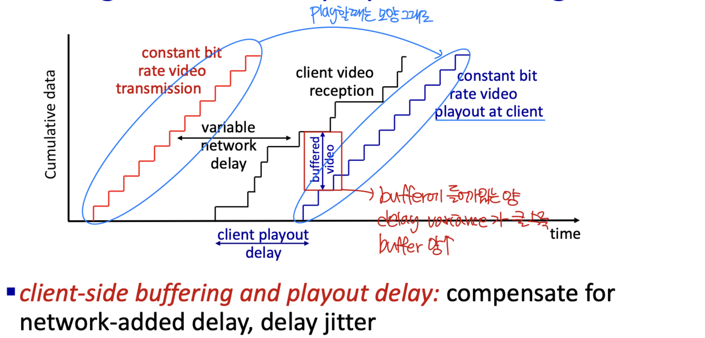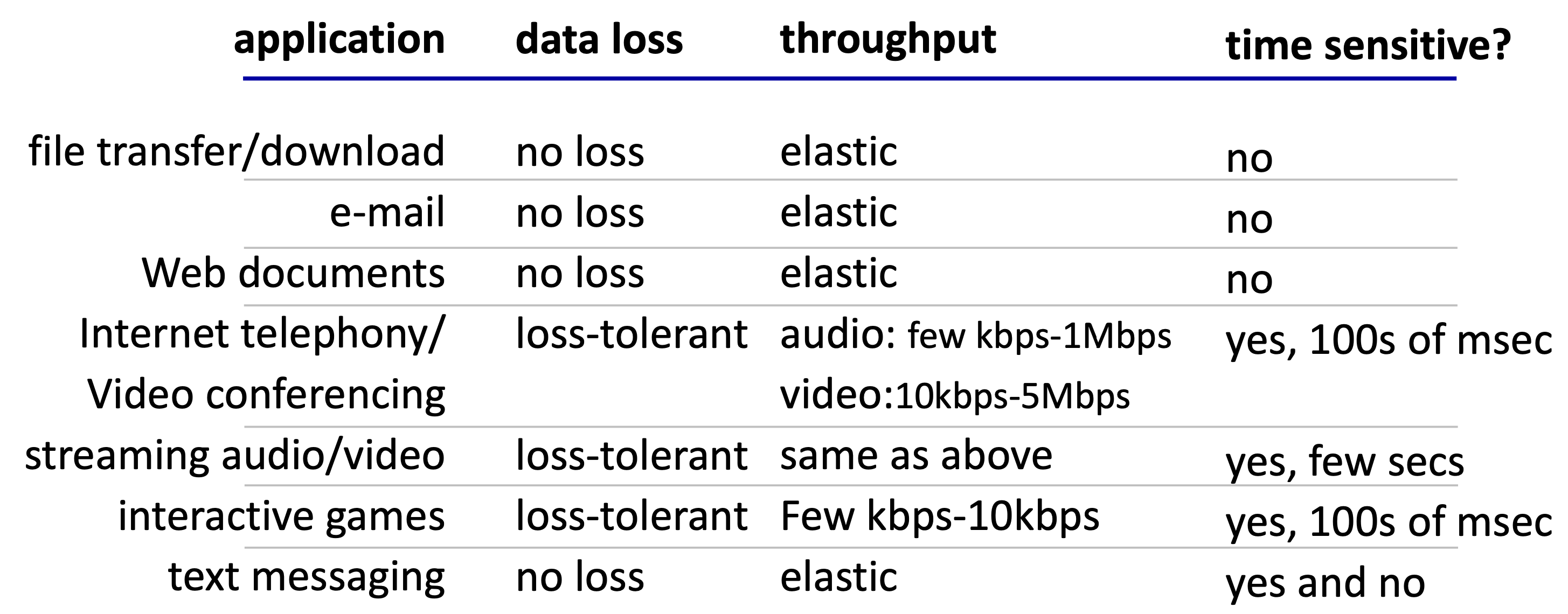 - Timing (시간): 인터넷 전화나 인터랙티브 게임처럼 **낮은 지연(low delay)**이 필수인 앱이 있다.