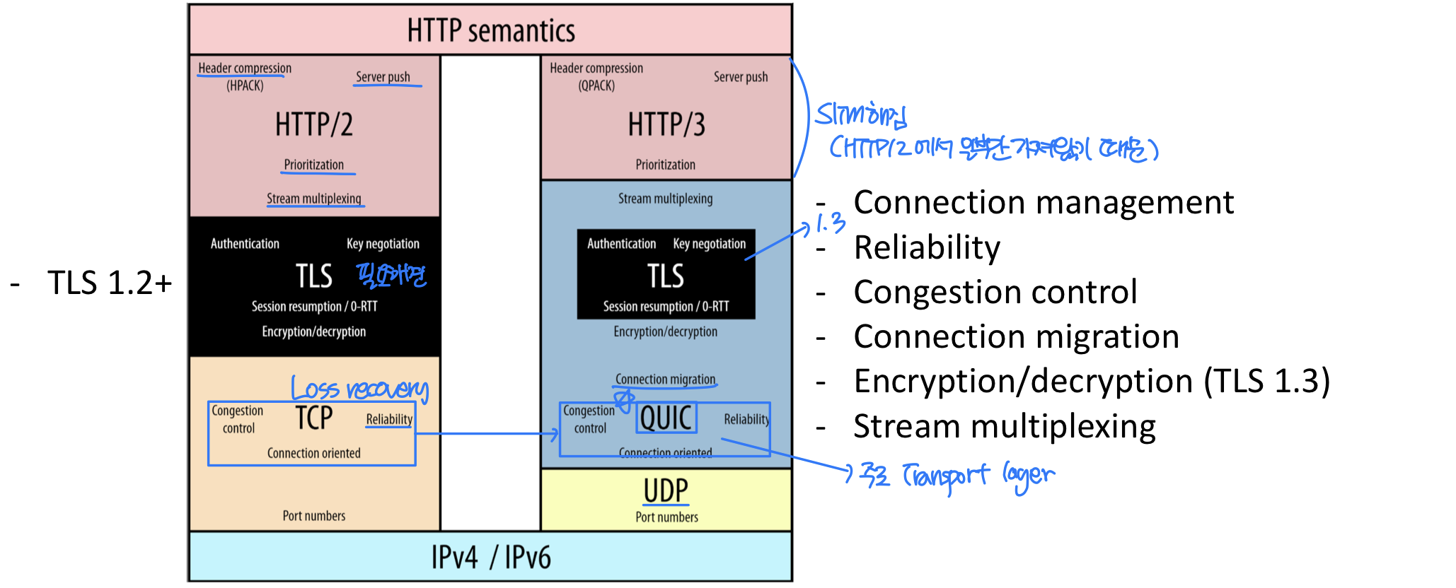 - TLS는 애플리케이션 계층에서 동작하며, 앱이 TLS 라이브러리를 사용하고 이것이 다시 TCP를 이용한다.