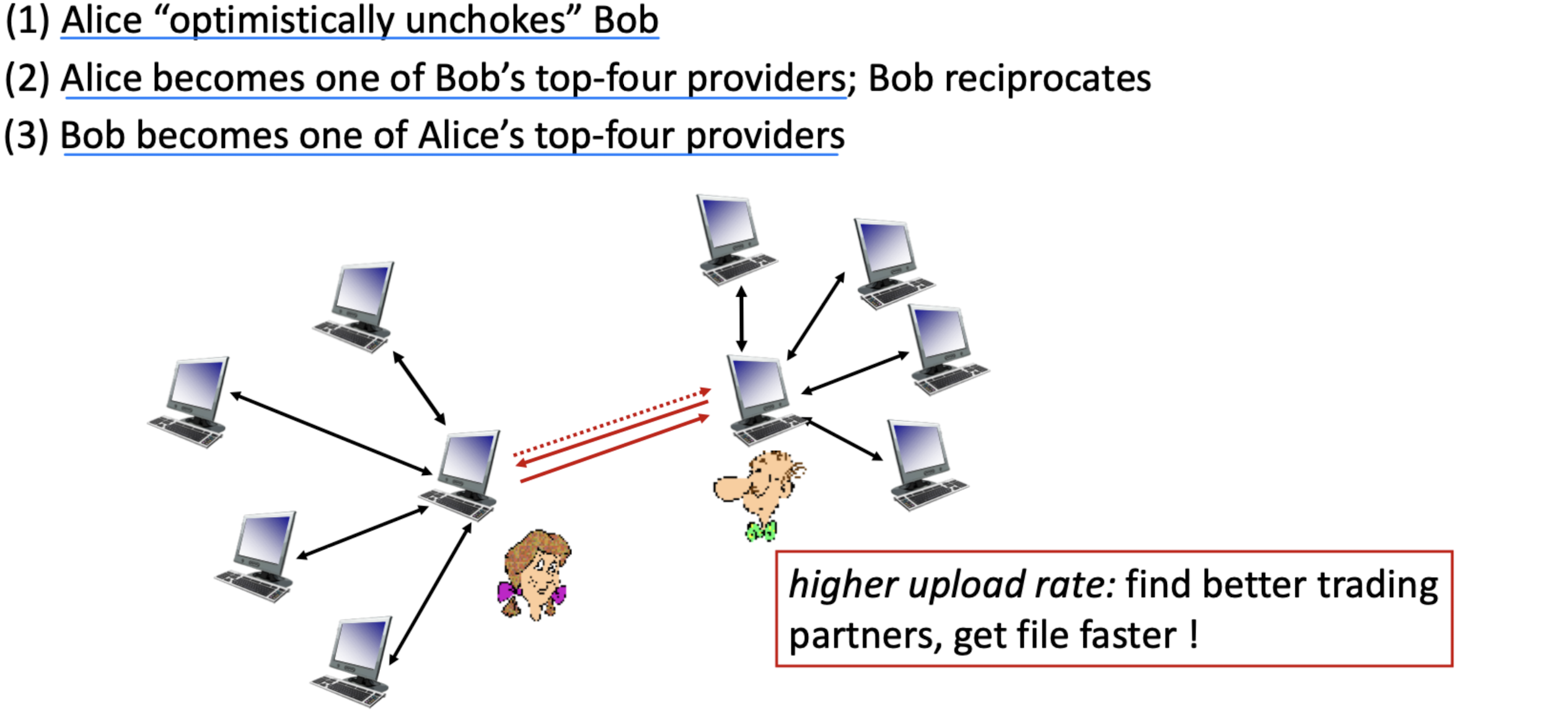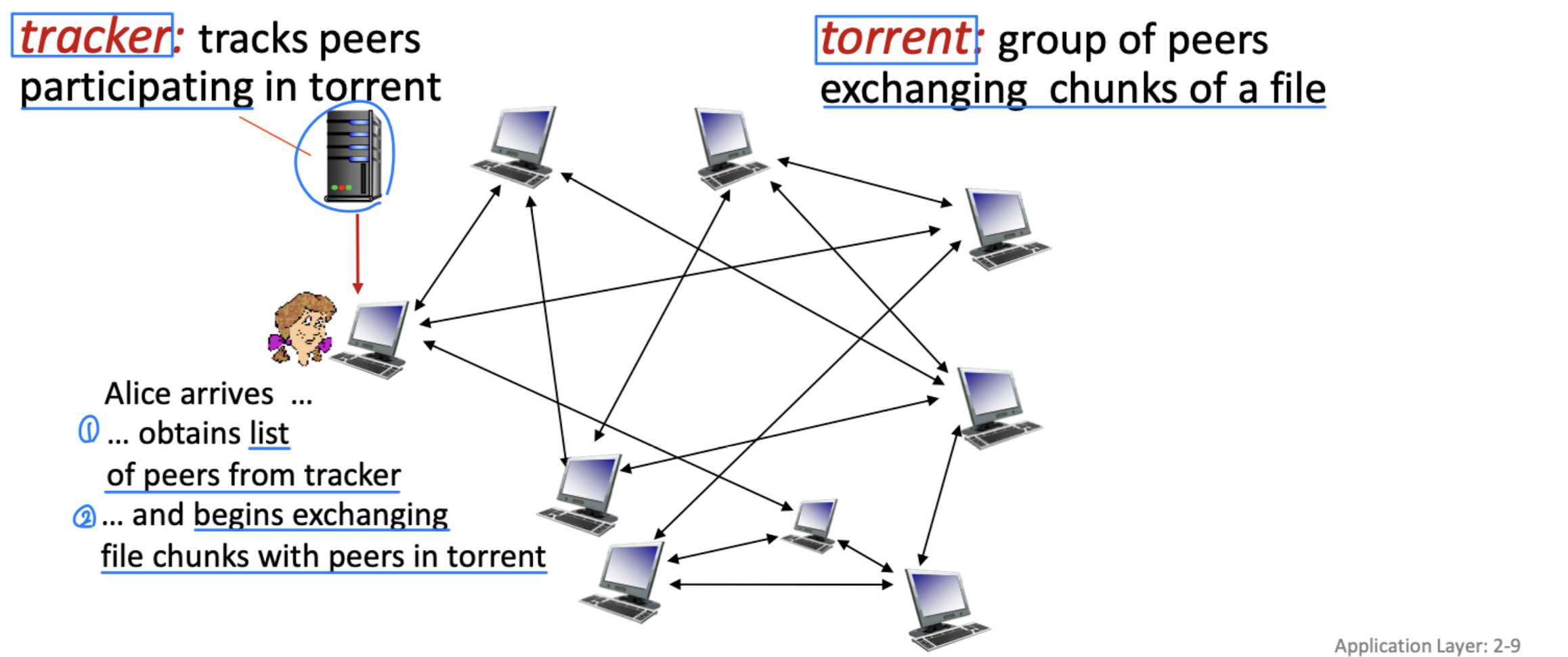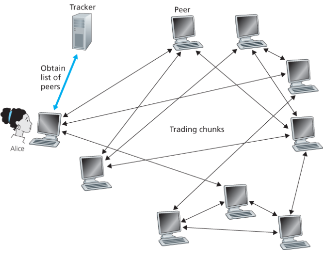 P2P에서는 항상 켜져 있는 서버가 없다. 임의의 end system들이 직접 통신한다. 각 peer는 다른 peer에게 서비스를 요청하는 동시에 서비스를 제공한다.
