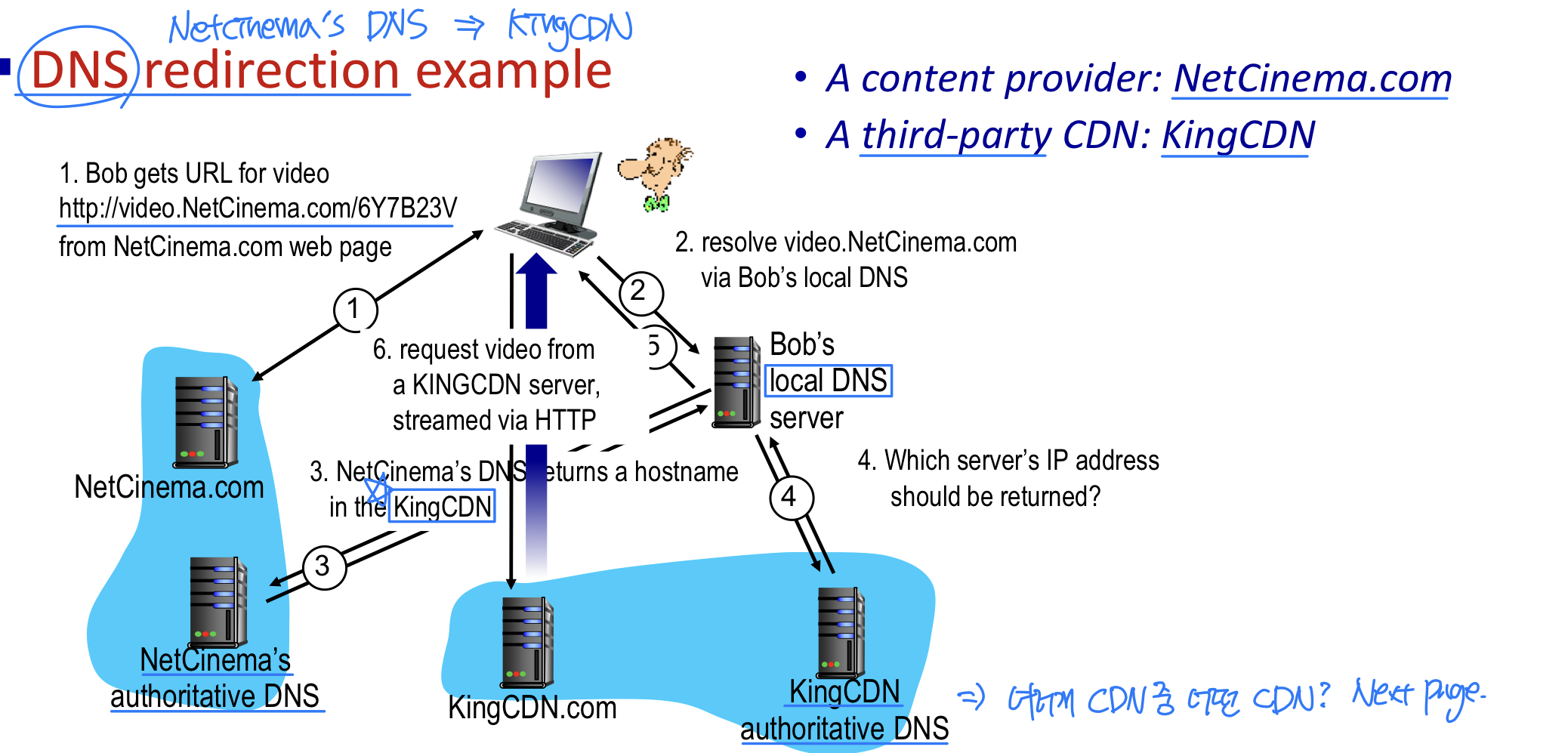 - 로컬 DNS가 책임 DNS 서버로 질의를 전달한다. 책임 DNS 서버는 CDN 서버의 책임 DNS 서버 IP를 전달한다.
