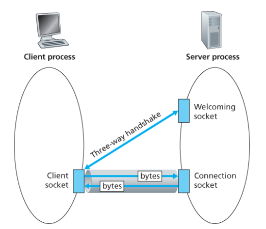 서버 프로세스가 실행되면, 클라이언트가 서버의 **환영 소켓(welcome socket)**에 TCP 연결을 시도한다. 핸드셰이킹이 완료되면 서버는 해당 클라이언트에게 지정되는 **연결 소켓(connection socket)**을 생성한다. 클라이언트의 소켓과 서버의 연결 소켓은 마치 파이프처럼 직접 연결된다.