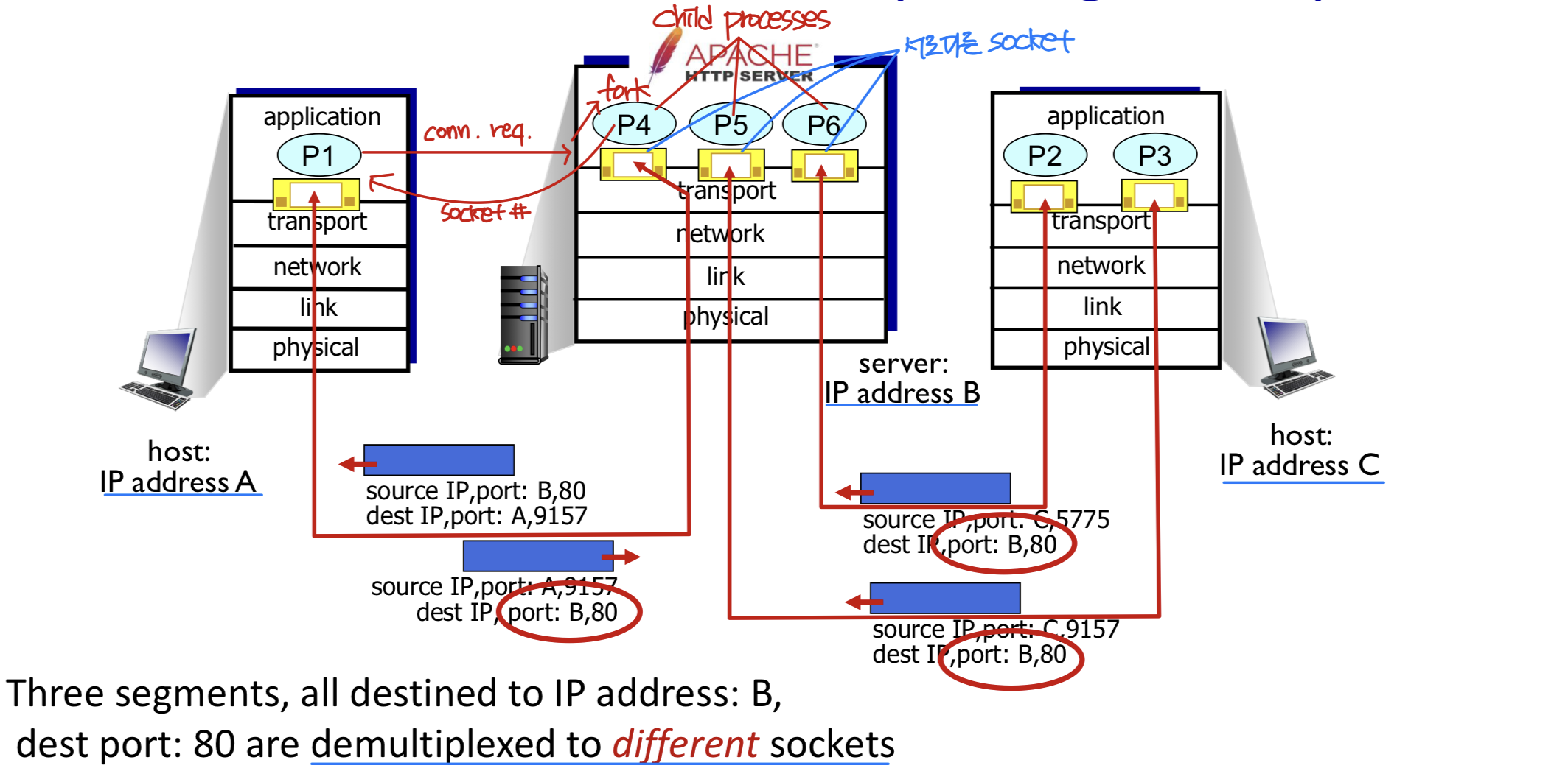 호스트가 TCP 세그먼트를 수신하면, 이 네 가지 값을 모두 사용하여 적절한 소켓으로 세그먼트를 전달한다.