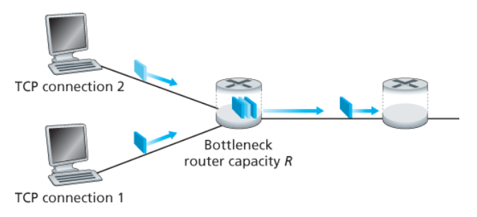 아래 그림처럼 전송률이 R인 링크 하나를 공유하는 2개의 TCP 연결을 살펴보자.