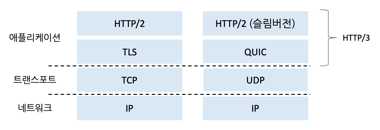 왼쪽 : 전통적인 보안 HTTP 프로토콜 스택 / 오른쪽 : 보안 QUIC 기반 HTTP/3 프로토콜 스택