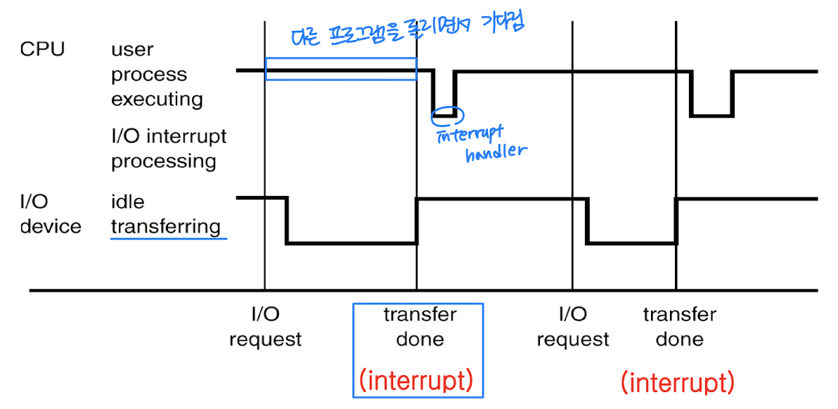 - CPU가 I/O 요청을 보내고 현재 프로세스를 계속 실행하거나 다른 작업을 수행한다