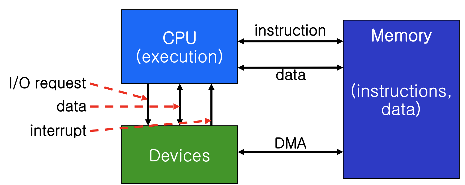 CPU는 메인 메모리와 로컬 버퍼 사이에서 데이터를 이동시킨다. I/O는 장치에서 컨트롤러의 로컬 버퍼로 수행된다. 장치 컨트롤러는 작업이 완료되면 인터럽트(Interrupt) 를 발생시켜 CPU에 알린다. 덕분에 CPU는 I/O 작업을 기다리지 않고 다른 작업을 수행할 수 있다.