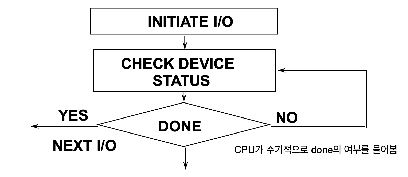 CPU가 장치 상태를 주기적으로 확인(Polling) 하는 방식이다. 문제는 CPU가 I/O 장치를 기다리는 동안 아무것도 하지 못한다는 점이다. 가장 중요하고 비싼 자원인 CPU를 낭비하게 된다.