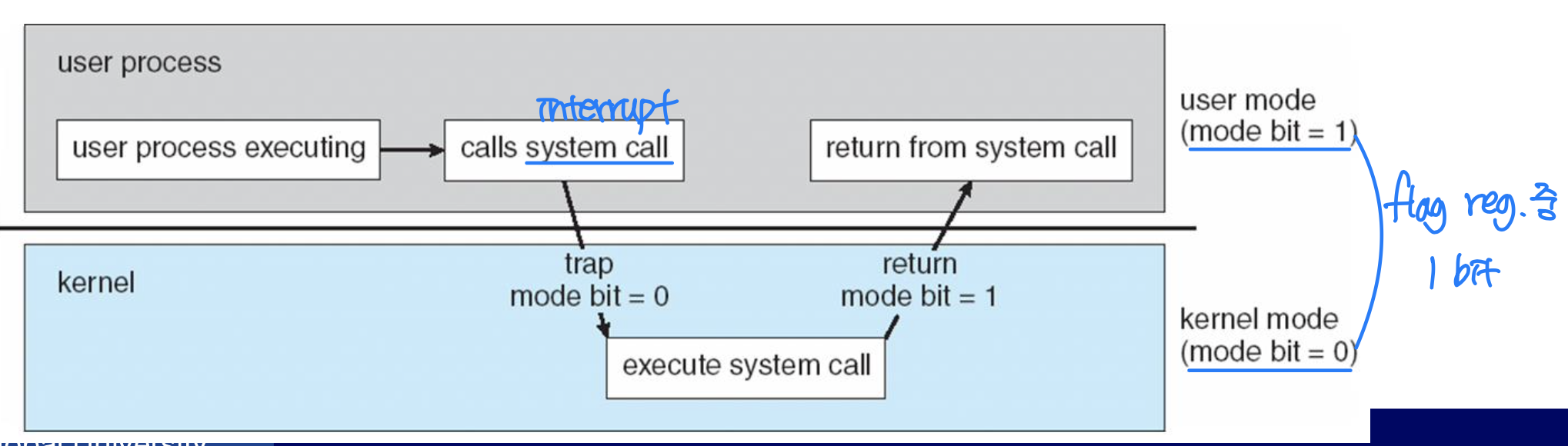 만약 사용자 모드에서 특권 명령어를 실행하면? 인터럽트가 발생하고, 인터럽트 핸들러로 점프한 뒤 커널이 해당 프로세스를 종료(terminate)시킨다.