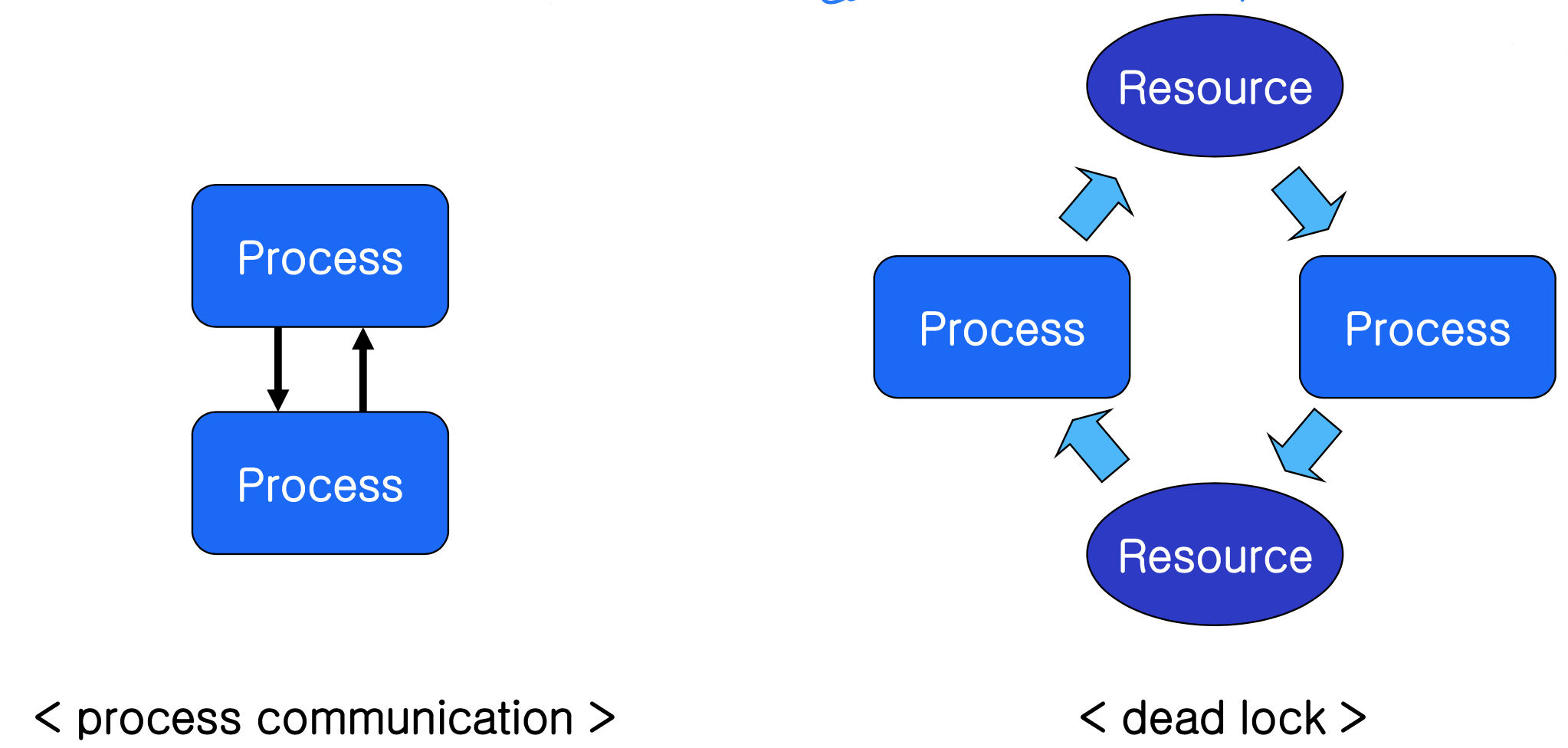 - 프로세스 통신(Communication): 두 개 이상의 프로세스가 협력할 때 자원이 공유되지 않기 때문에 OS의 특별한 통신 장치가 필요하다