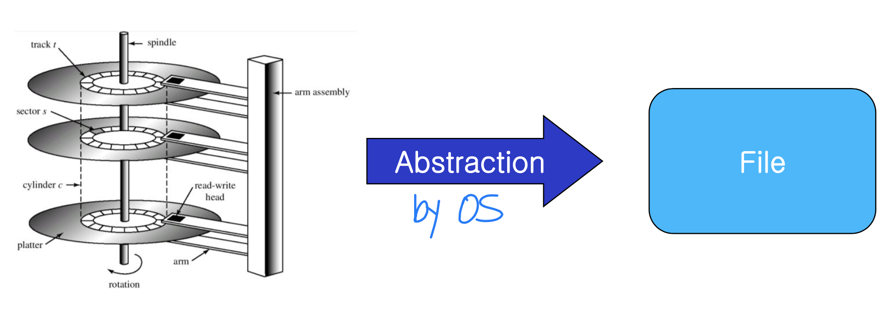 물리적 저장 장치(자기 디스크, 광학 디스크, 자기 테이프 등)를 논리적 파일(File) 로 추상화하는 것이 스토리지 관리의 핵심이다. 물리적 저장 장치는 속도, 용량, 전송률, 접근 방식이 다양하며, 파일은 OS가 추상화한 논리적 저장 단위다.