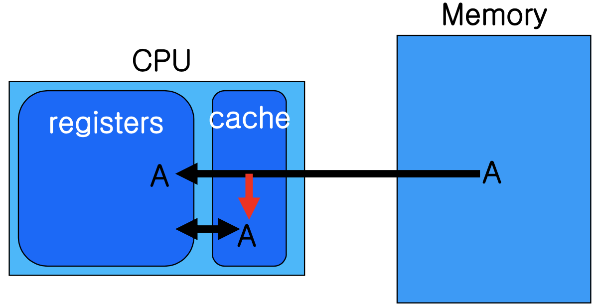 멀티프로세서 환경에서는 캐시 일관성(Cache Coherence) 을 하드웨어적으로 보장해야 한다. 모든 CPU가 캐시에서 가장 최신 값을 가지고 있어야 한다.