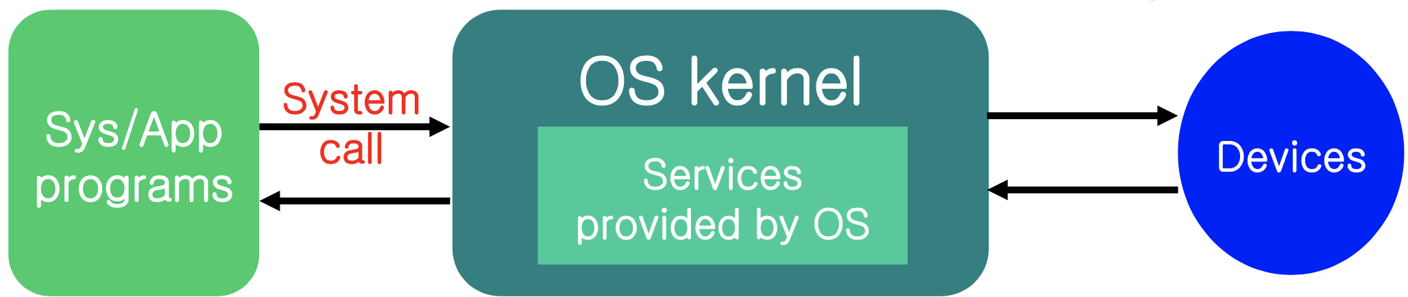- 인터럽트를 통해 커널 함수를 호출하며, user mode에서 kernel mode로 전환된다