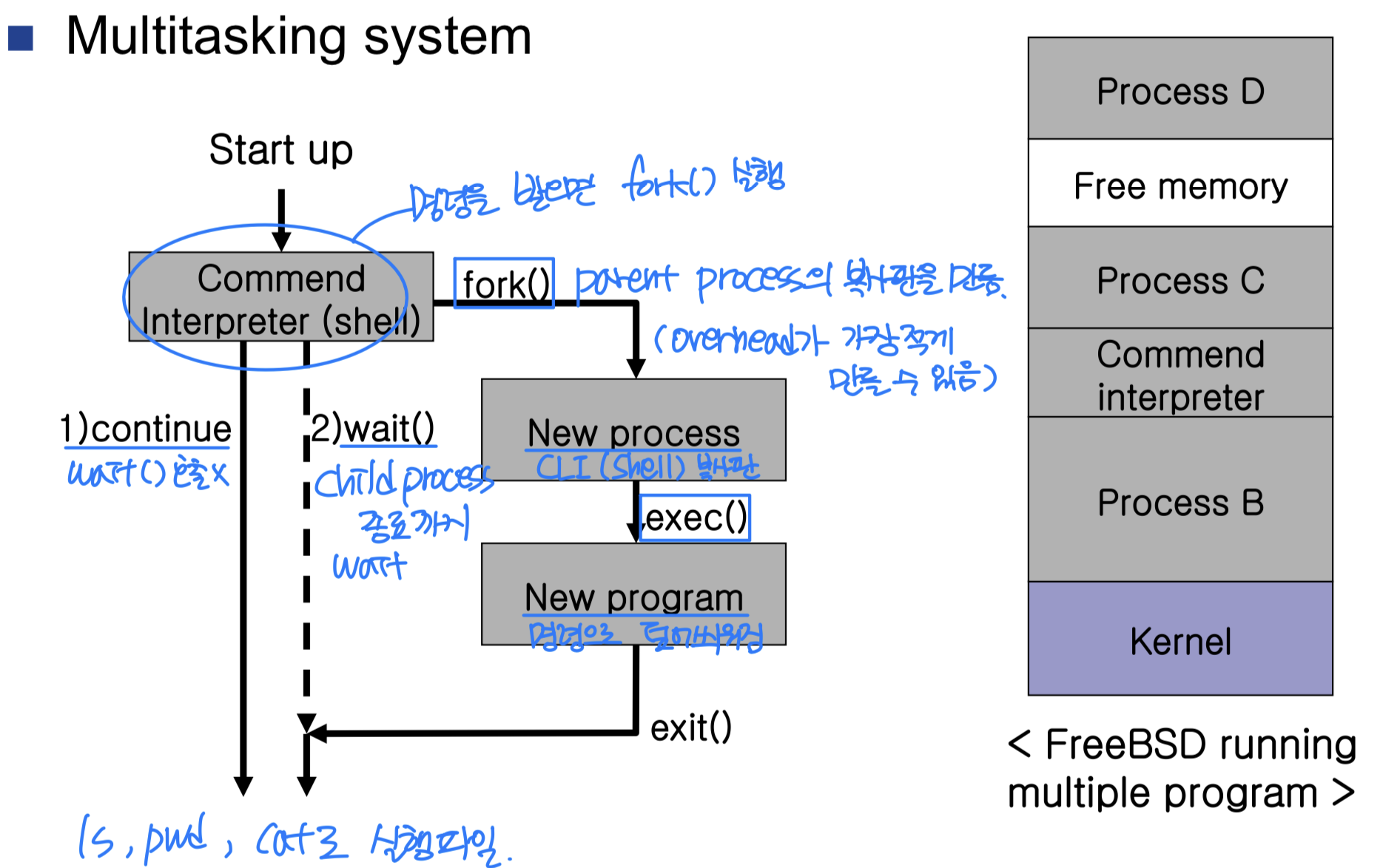 커맨드 인터프리터는 새 프로그램을 실행한 뒤에도 계속 실행될 수 있다. 부모의 실행에는 두 가지 경우가 있다.