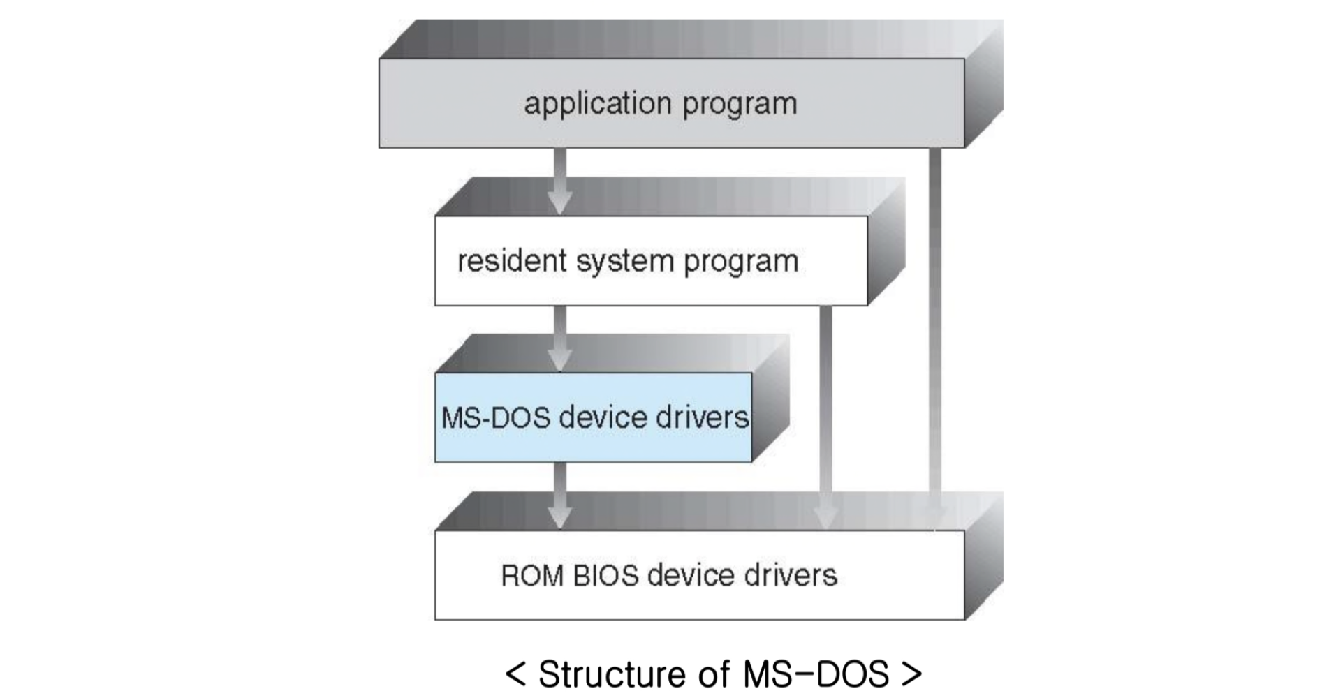 - 모놀리식(Monolithic): MS-DOS, 초기 UNIX, Linux