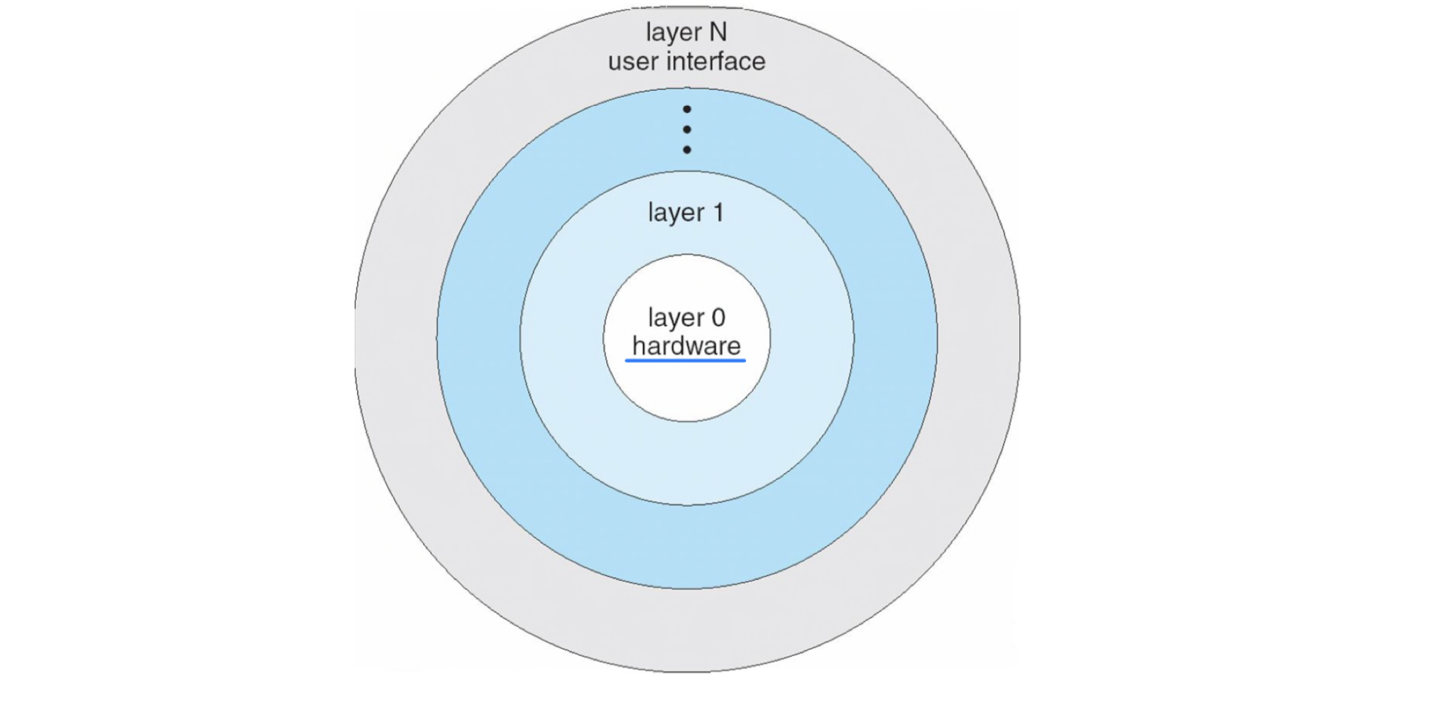 운영체제를 여러 계층(Layer) 으로 구성하는 방식이다. 각 계층은 추상 객체와 연산을 구현하며, 하위 계층의 함수/서비스만을 사용한다. 상위 계층은 하위 계층을 호출하고, 하위 계층은 상위 계층에 의해 호출된다.