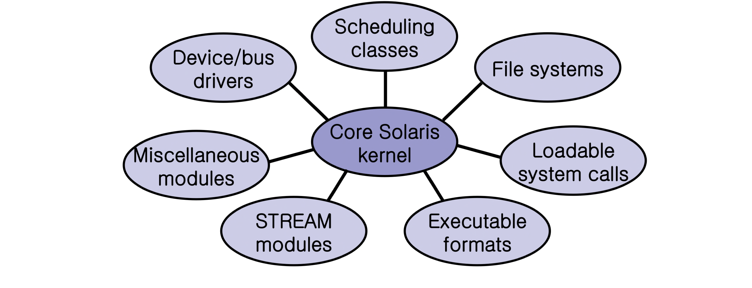 - Linux, Solaris: 커널 주소 공간 안에 모놀리식 구조를 사용하면서, 기능의 동적 로딩을 위해 모듈 방식을 결합