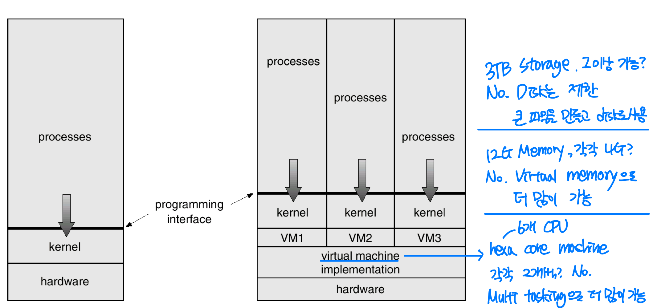- OS 연구, 개발, 교육에 완벽한 도구: OS를 변경하는 것은 위험한 작업이다. VM에서 작업하면 물리 머신을 중단할 필요가 없다