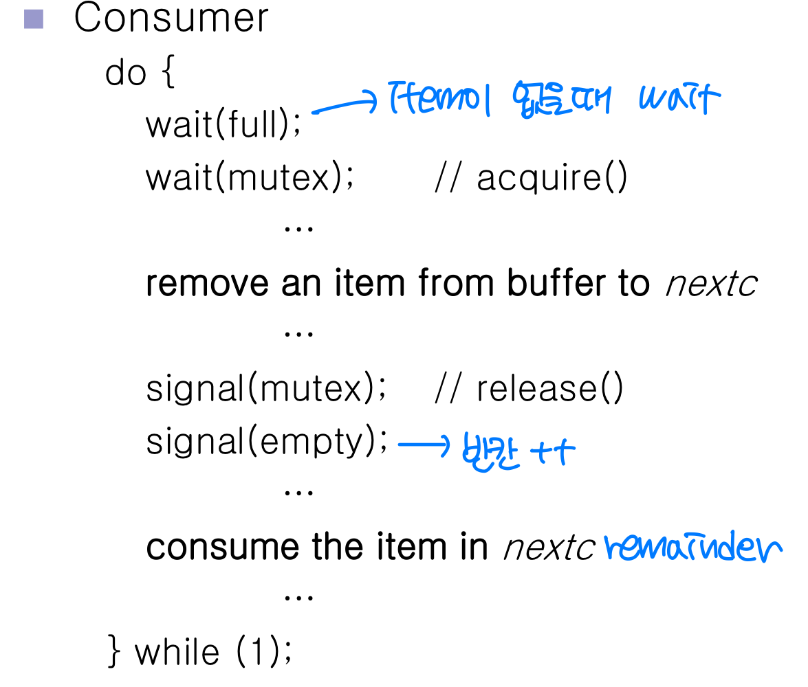 - 버퍼가 비어 있으면, 소비자는 생산자가 항목을 넣을 때까지 대기해야 한다