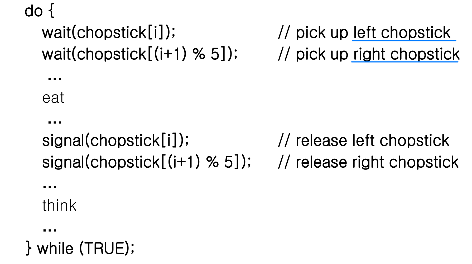 각 철학자가 왼쪽 젓가락을 먼저 집고 오른쪽 젓가락을 집는 방식은 가능하지만, 데드락(Deadlock) 이 발생할 수 있다.