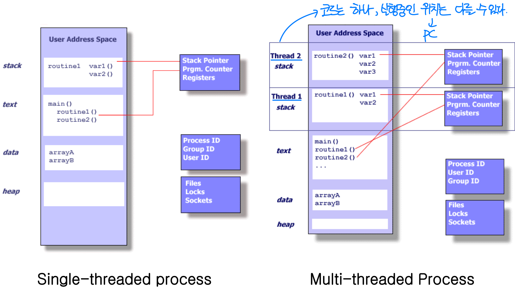 - 프로세스보다는 가볍지만, 사용자 스레드보다는 비용이 크다 (프로세스 > 커널 스레드 > 사용자 스레드)