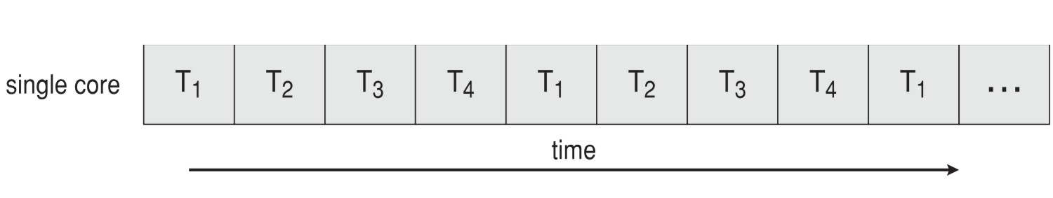 동시성(Concurrency) 은 여러 작업이 진행 중인 상태를 의미한다. 싱글 코어 환경에서도 스케줄러가 타임 셰어링을 통해 동시성을 제공할 수 있다. 실제로 동시에 실행되는 것이 아니라 빠르게 번갈아 실행하는 것이다.