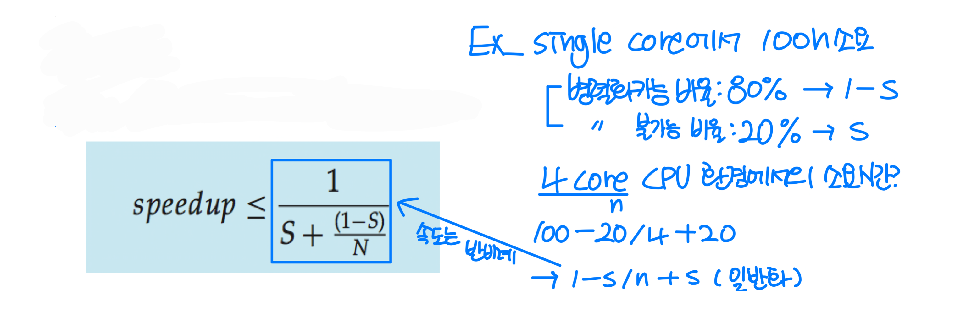여기서 S는 직렬 실행 비율, N은 프로세싱 코어 수다.