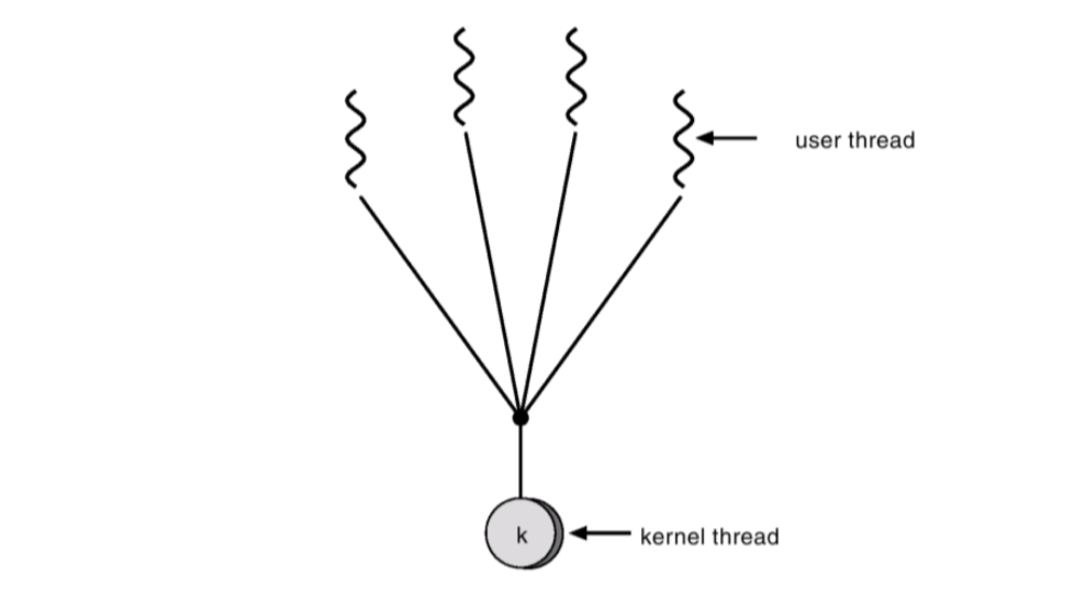 여러 사용자 스레드가 하나의 커널 스레드에 매핑되는 구조다. 스레드 관리는 사용자 수준 스레드 라이브러리가 담당한다.