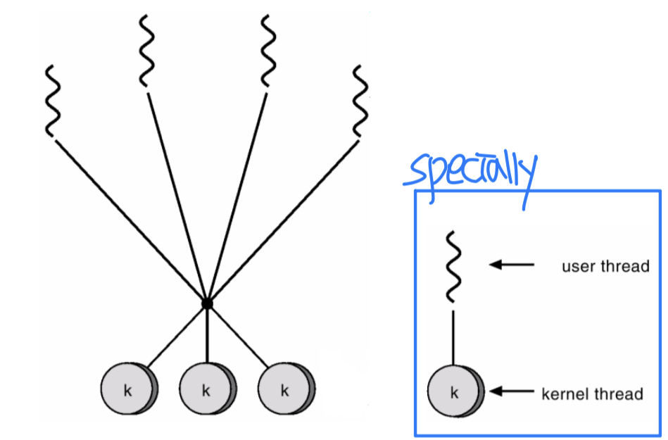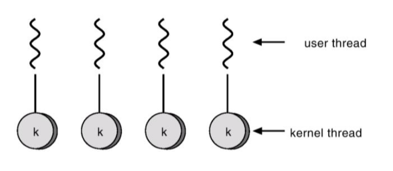 각 사용자 스레드가 하나의 커널 스레드에 매핑된다. 더 높은 동시성을 제공하지만, 스레드 생성 시 오버헤드가 발생한다. 스레드 관리는 커널이 담당한다.