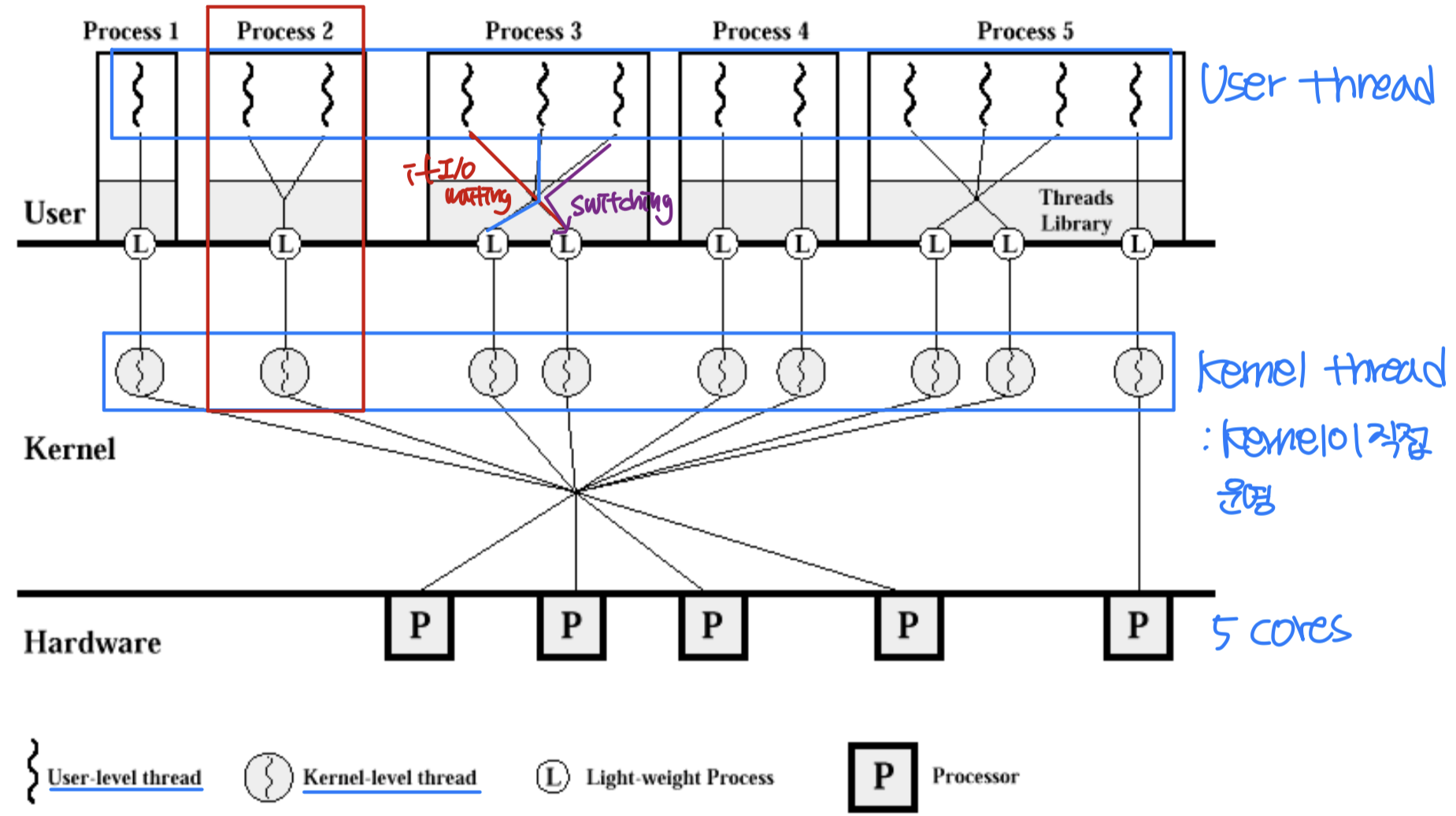- 커널 스레드가 블록되면: 해당 LWP를 다른 스레드에 할당