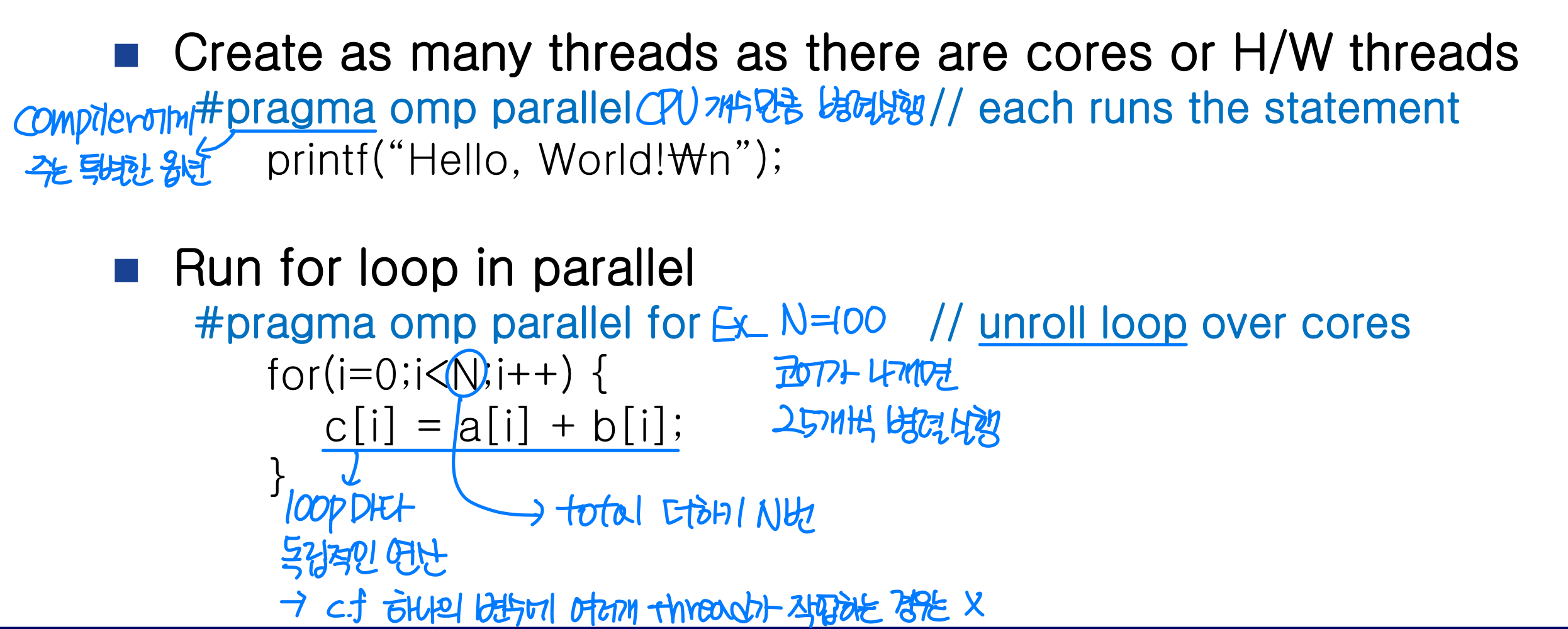 OpenMP는 공유 메모리 환경에서의 병렬 프로그래밍을 지원하는 도구다. C, C++, FORTRAN용 컴파일러 지시어(Directive)와 API를 제공하며, 병렬 실행 가능한 코드 블록(병렬 영역, Parallel Region) 을 식별하여 자동으로 병렬화한다.