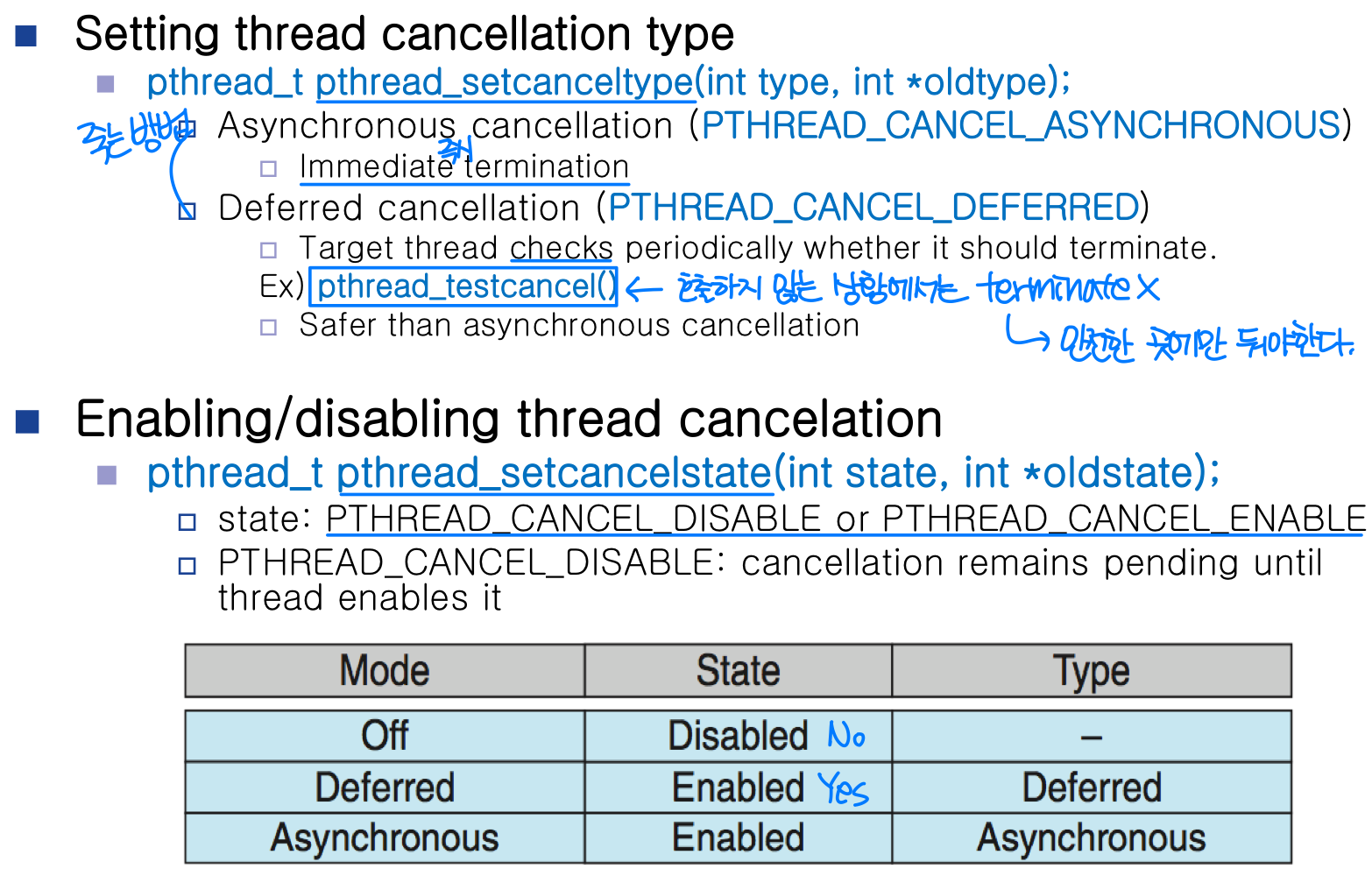 pthread_cancel(tid) 함수를 사용하며, 이 호출은 즉시 스레드를 죽이는 명령이 아니라 취소 요청을 보내는 것이다.