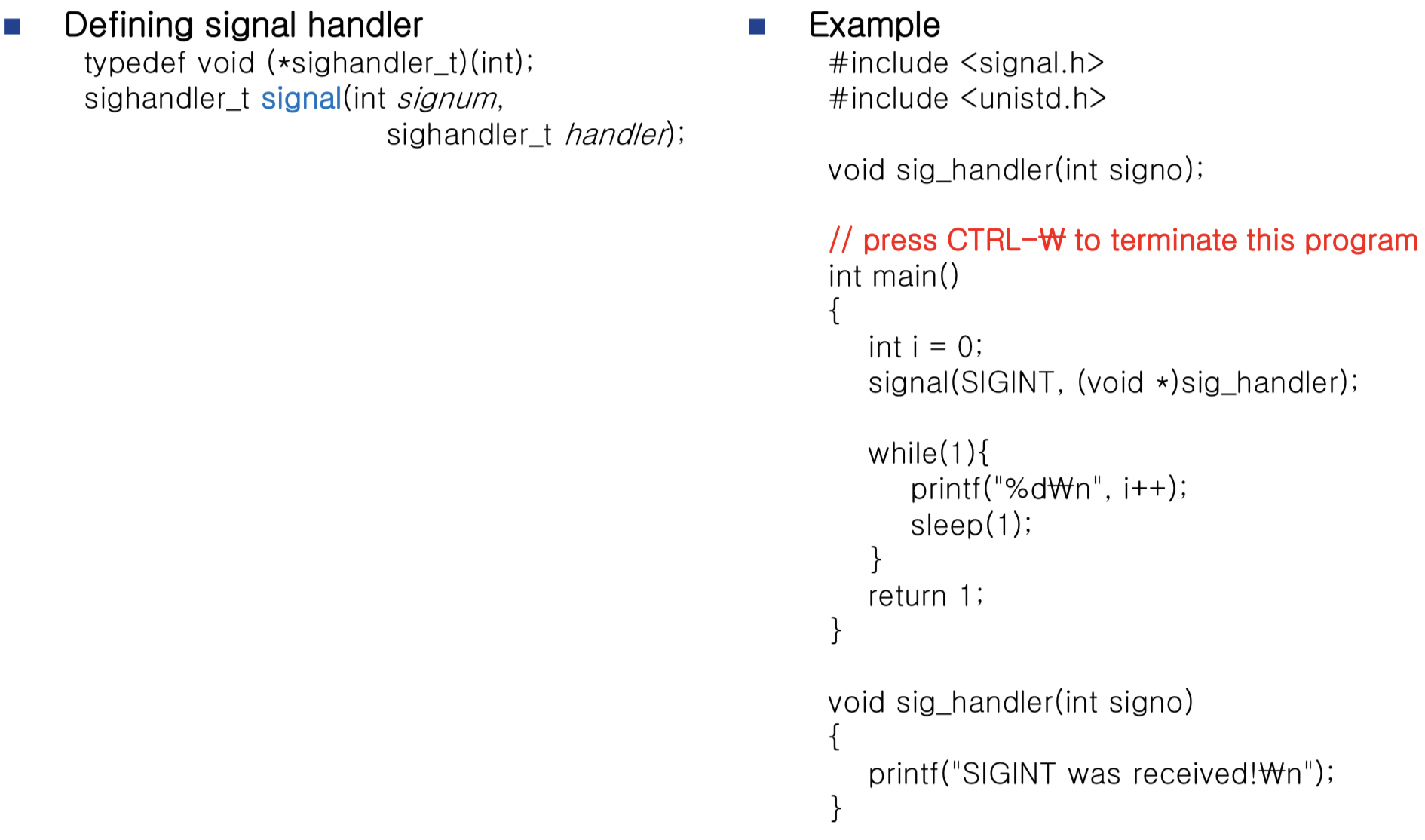 - 프로세스가 시그널을 처리한다 - 기본 시그널 핸들러(커널 제공) 또는 사용자 정의 핸들러를 통해