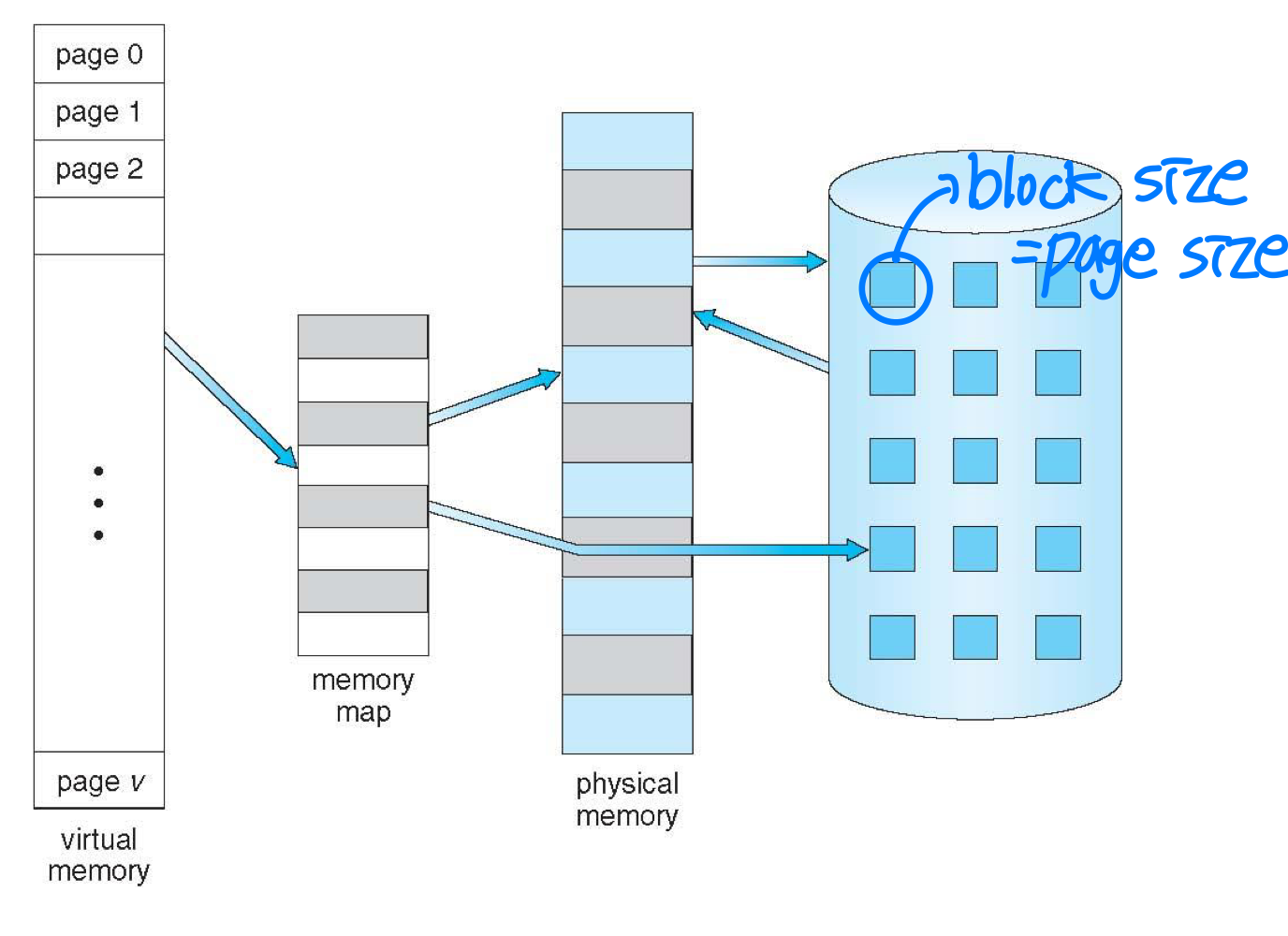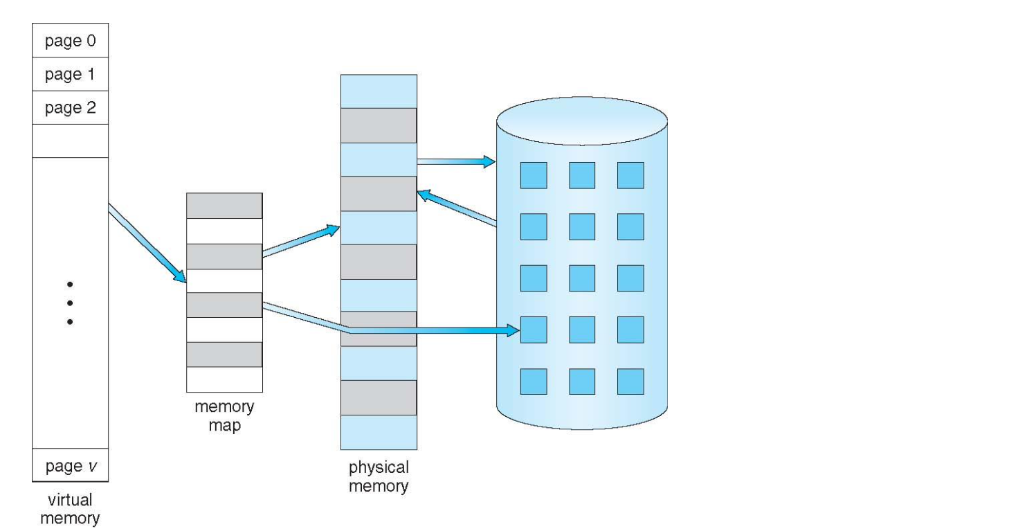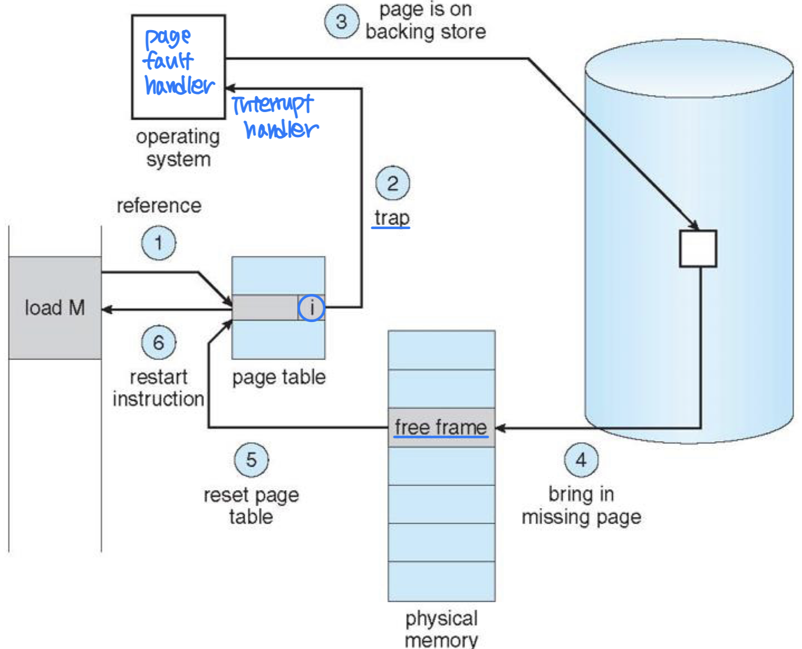 페이지는 프로그램 실행 중 요구될 때만 적재된다. 이를 위해서는 해당 페이지가 메모리에 있는지 디스크에 있는지 구분하는 하드웨어 지원이 필요하다.
