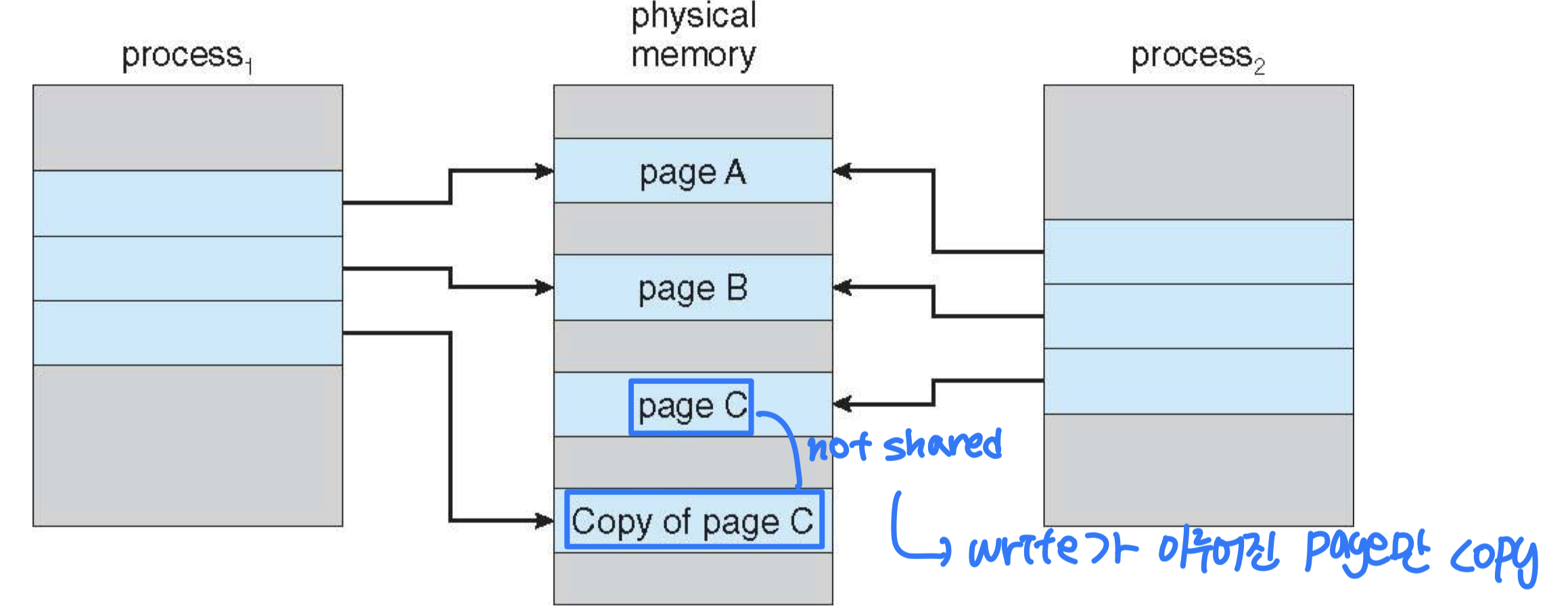 - 프로세스가 생성될 때 페이지를 실제로 복제하지 않고 공유만 한다 (프로세스 생성 시간 단축)