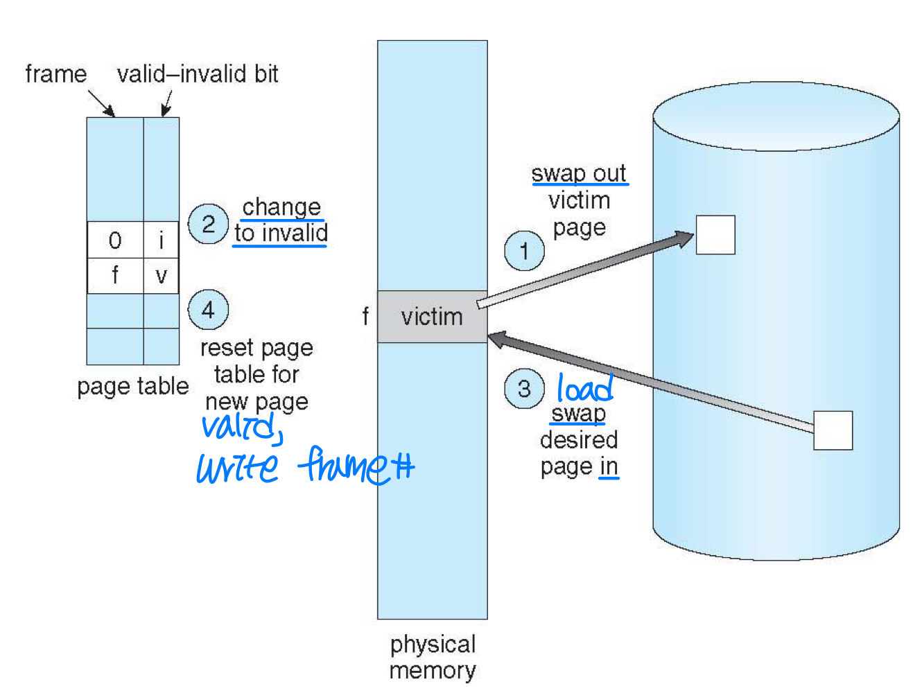 페이지 폴트가 발생했는데 빈 프레임이 없다면, 현재 사용되지 않는 프레임을 찾아 스왑 아웃(swap out) 해야 한다.
