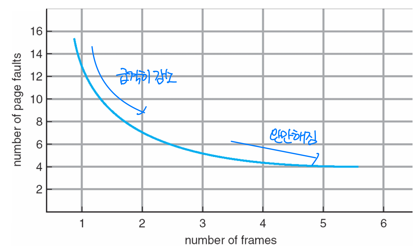 - 프로세스 에 할당된 프레임이 보다 적으면 페이지 폴트가 급격히 증가하여 성능이 크게 저하된다