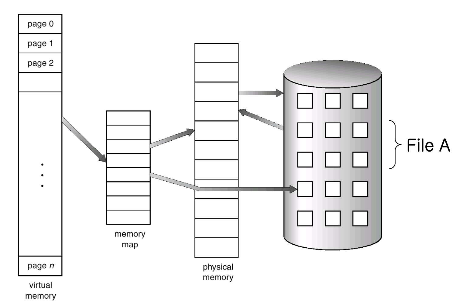 메모리 매핑 파일(Memory-Mapped File) 은 가상 주소 공간의 일부를 파일과 논리적으로 연관시키는 기법이다. 디스크 블록을 메모리의 페이지에 매핑한다.