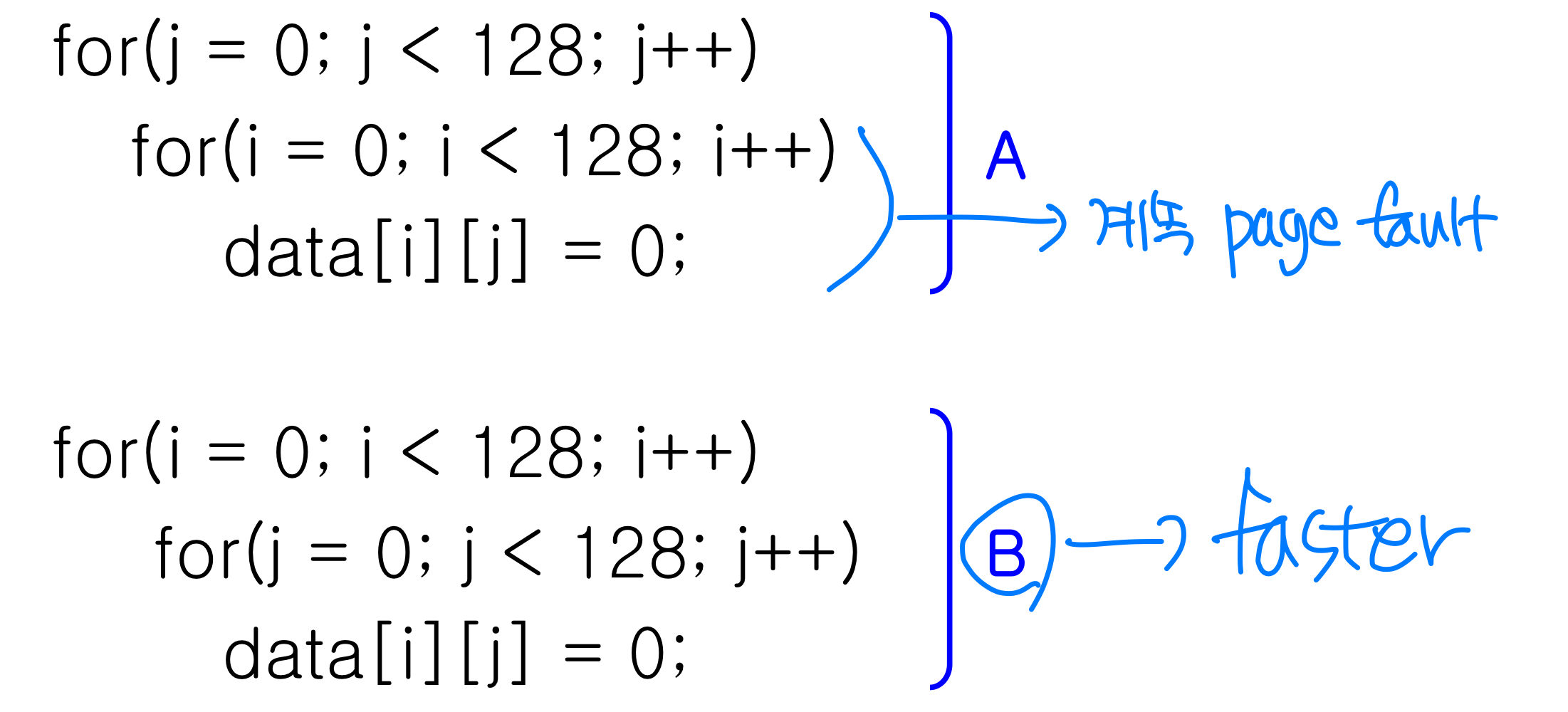 예를 들어 페이지 크기가 128워드(정수 크기)일 때, 아래 두 코드 중 B가 더 좋은 성능을 보인다.