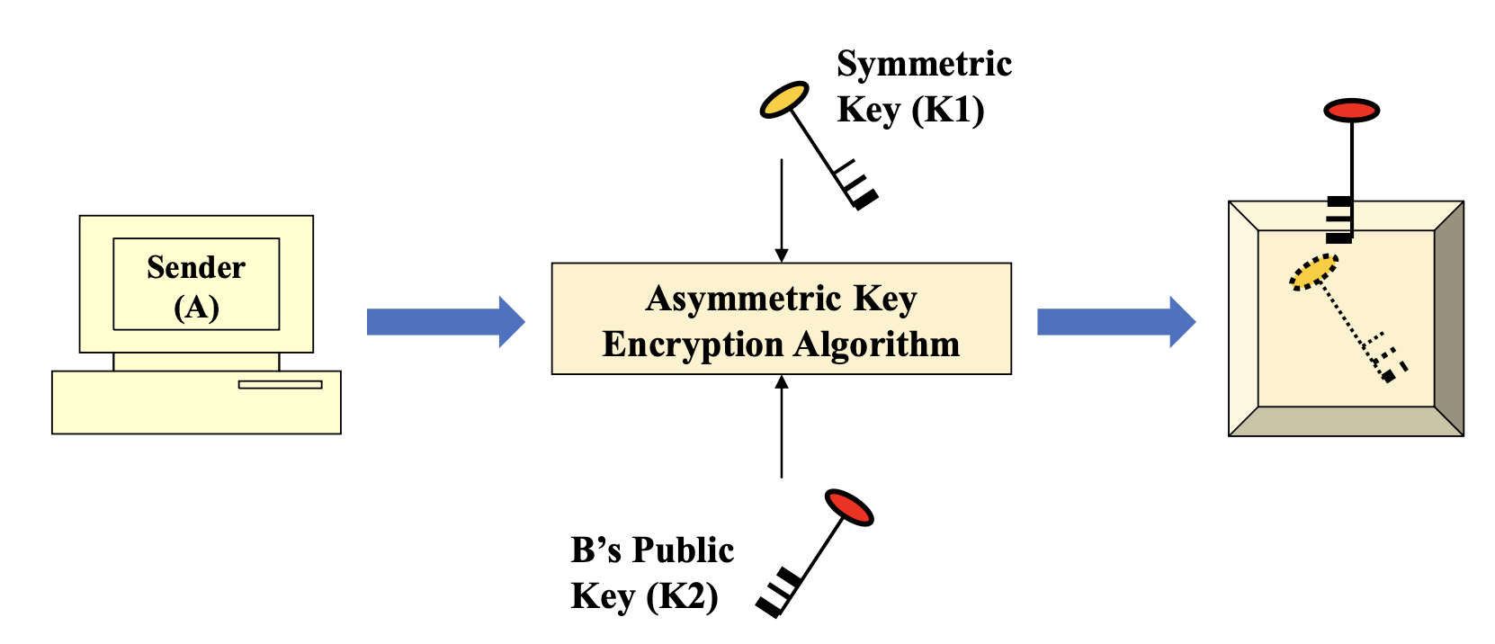 - 대칭키를 수신자의 공개키로 암호화 (키 분배 문제 해결)